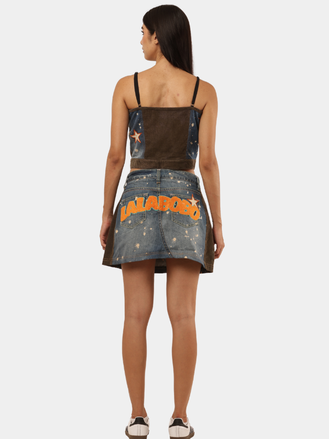 This 1 of 1 upcycled corset top is crafted from reclaimed denim, giving new life to pre-loved fabric through bold design and careful reconstruction. The piece features striking star appliqués in contrast tones, scattered across the front for a playful yet edgy aesthetic.