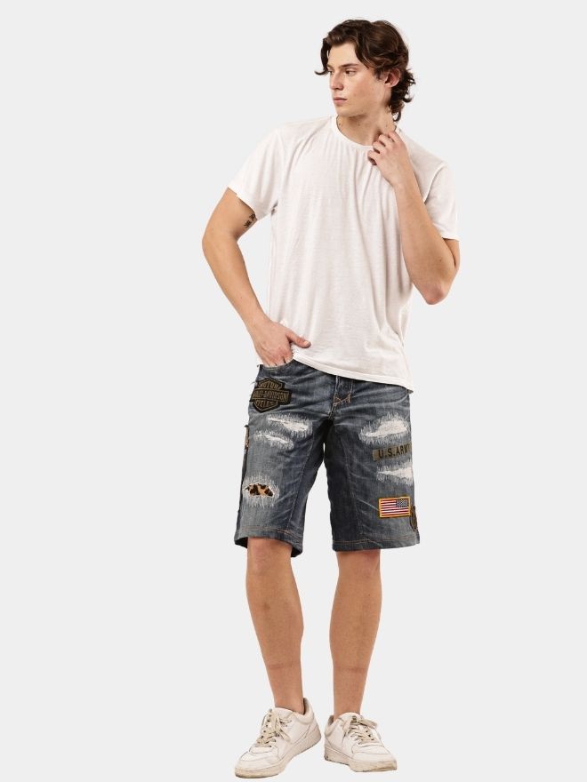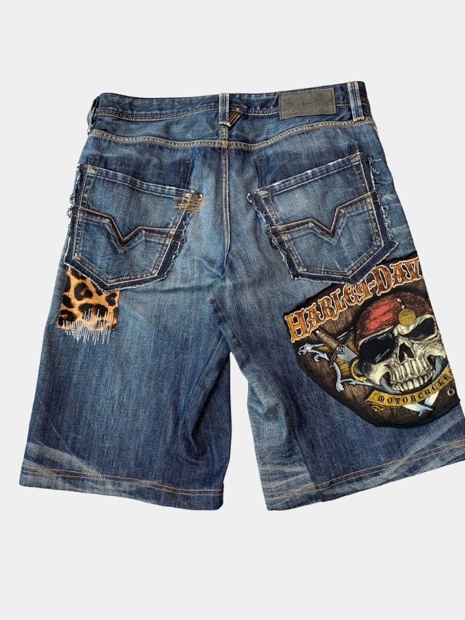 Stand out in style with this unique 1-of-1 pair of patch and distressed denim jorts. Handcrafted with bold patchwork details and heavy distressing, these shorts embody raw streetwear energy and vintage edge.