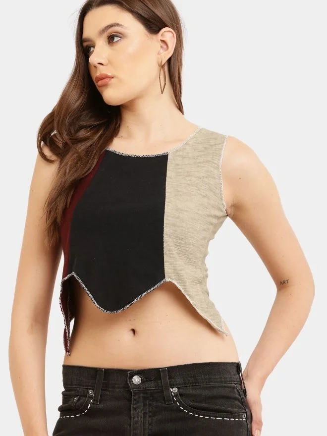 The sleeveless knit panel top complements the denim perfectly. It is crafted using a combination of three different coloured knitted fabrics, thoughtfully arranged to create a striking visual balance. The structured yet comfortable silhouette provides a modern and sophisticated look that works effortlessly with the rugged aesthetic of the denim.