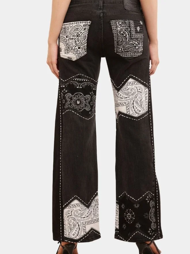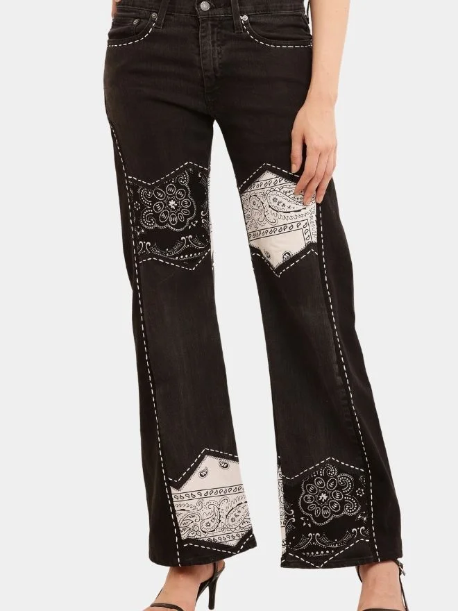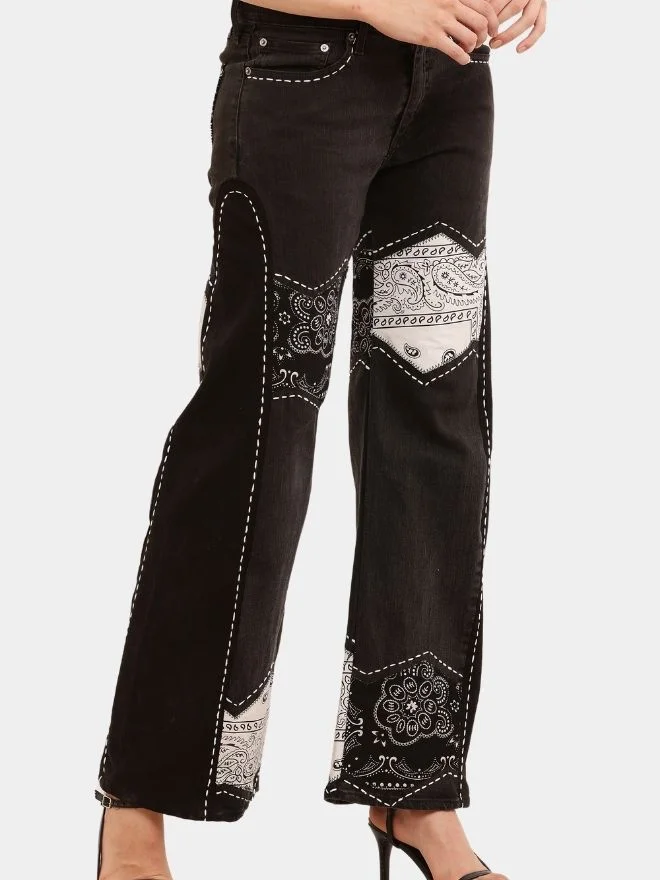 This statement co-ord set brings together vintage denim heritage and contemporary design through thoughtful rework and craftsmanship. The jeans are made from authentic Levi’s denim, carefully reconstructed with bandana print panels that add contrast, texture, and character to the garment. Each panel is secured with detailed hand running-stitch embroidery, giving the piece a raw, artisanal feel while maintaining durability.