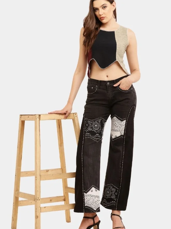 A bold upcycled co-ord set featuring reworked Levi’s denim jeans with bandana panel patchwork and hand running-stitch embroidery, paired with a sleeveless knit panel top crafted from three different coloured knitted fabrics. A unique blend of vintage denim and modern streetwear aesthetics.