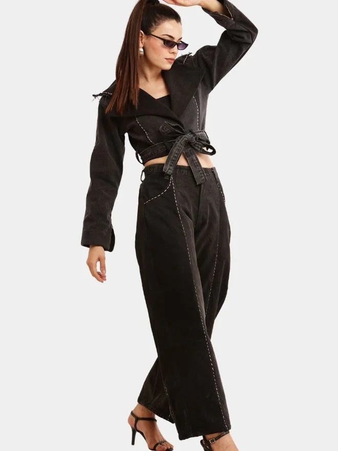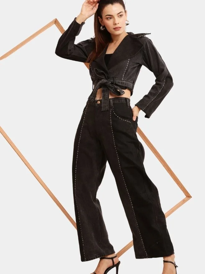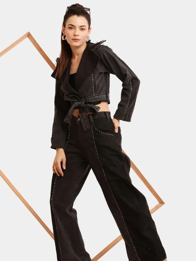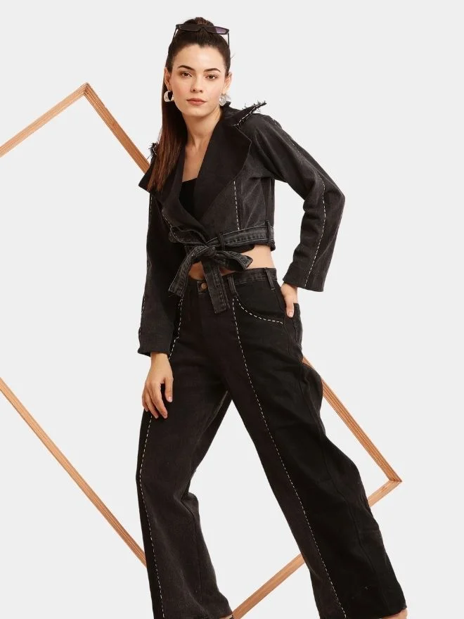 Designed in a modern cropped silhouette, the jacket features multiple tonal denim panels that create subtle contrast while maintaining a sleek monochromatic look. Between each panel, delicate running stitch embroidery highlights the craftsmanship and enhances the visual texture of the garment.