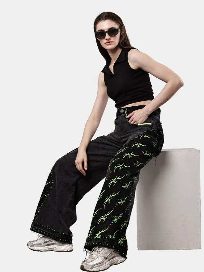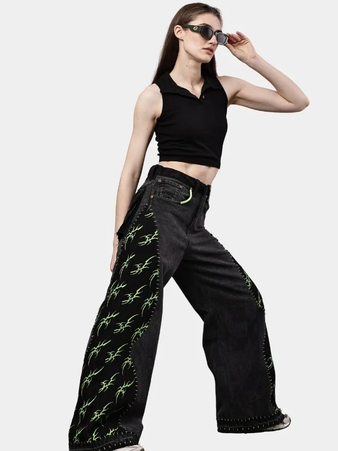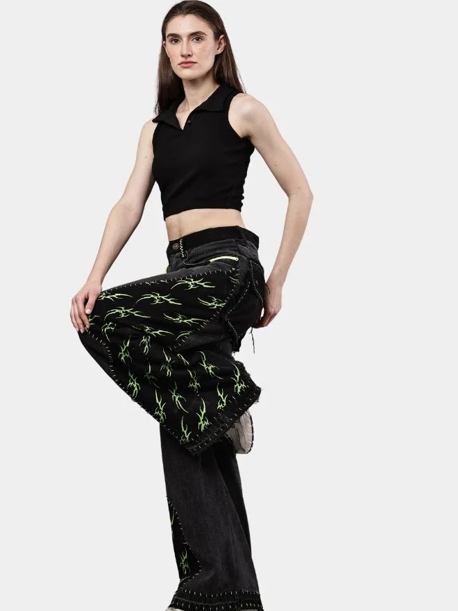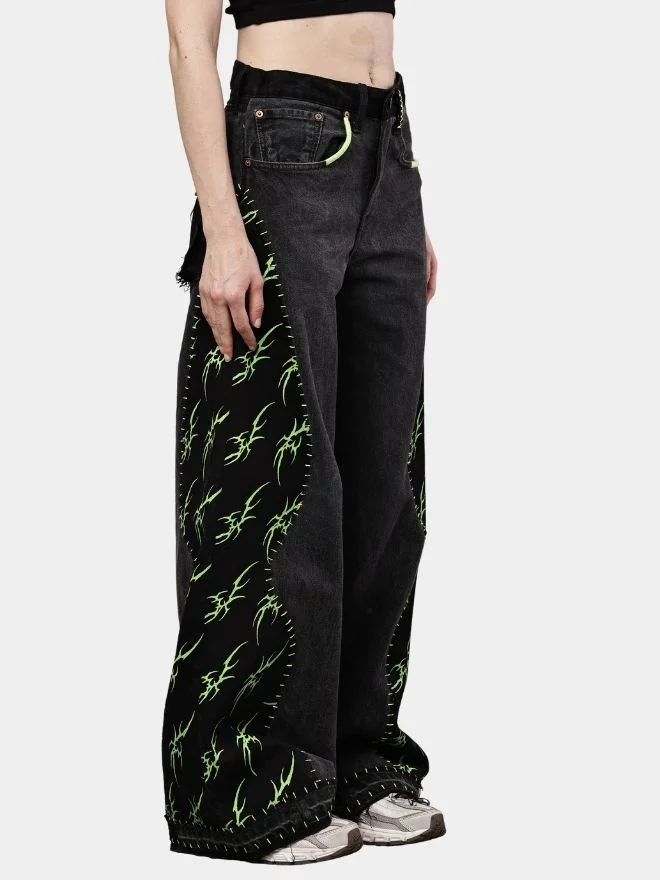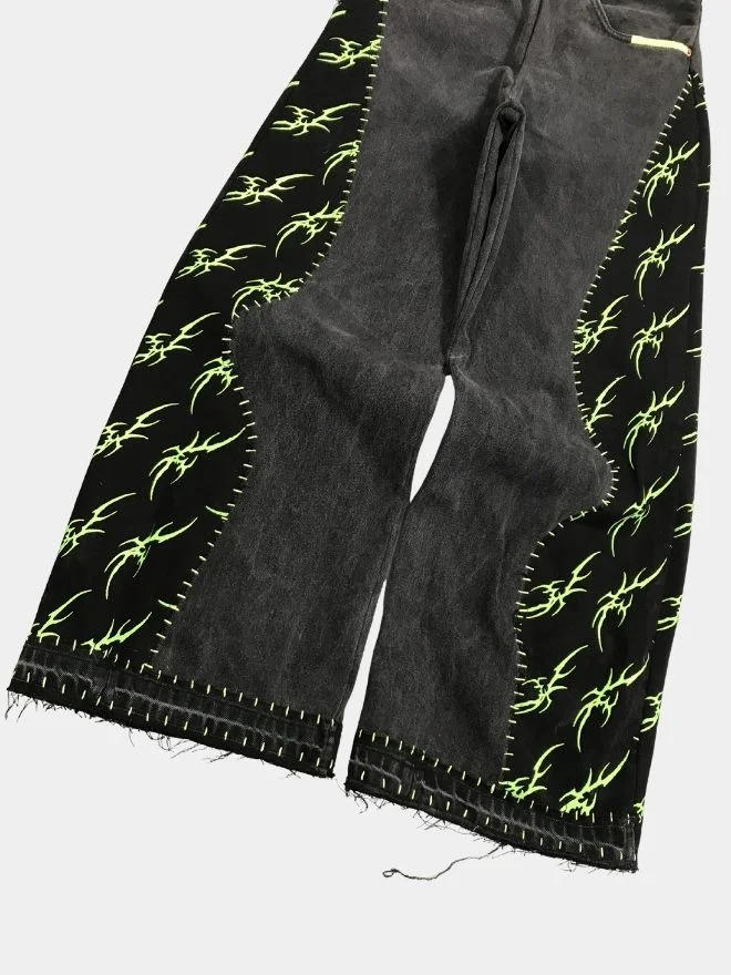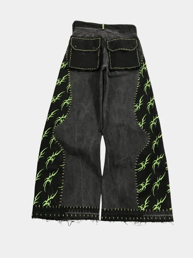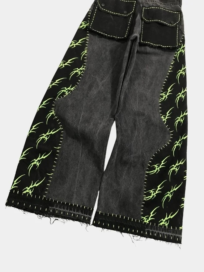 These black reworked baggy pants are crafted using carefully selected black patches featuring subtle patterns with neon color accents. The pants are hand-stitched using vibrant neon green thread, giving them a distinctive handcrafted aesthetic.