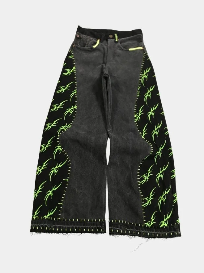 Reworked black patchwork pants featuring neon patterned patches and detailed neon green hand stitching. Designed with a relaxed baggy fit and unique handcrafted detailing on the waist and pockets for a bold streetwear look.