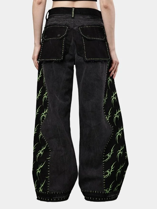 Black Patchwork Baggy Pants with Neon Green Hand Stitch