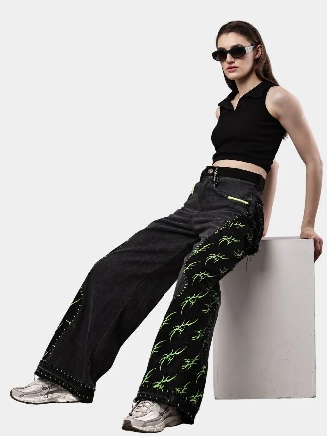 The design features detailed stitch work across the waistline and pockets, with additional work on the back pocket that adds character and uniqueness to the piece. The neon green stitching highlights the structure of the pants while creating a bold contrast against the black base fabric.