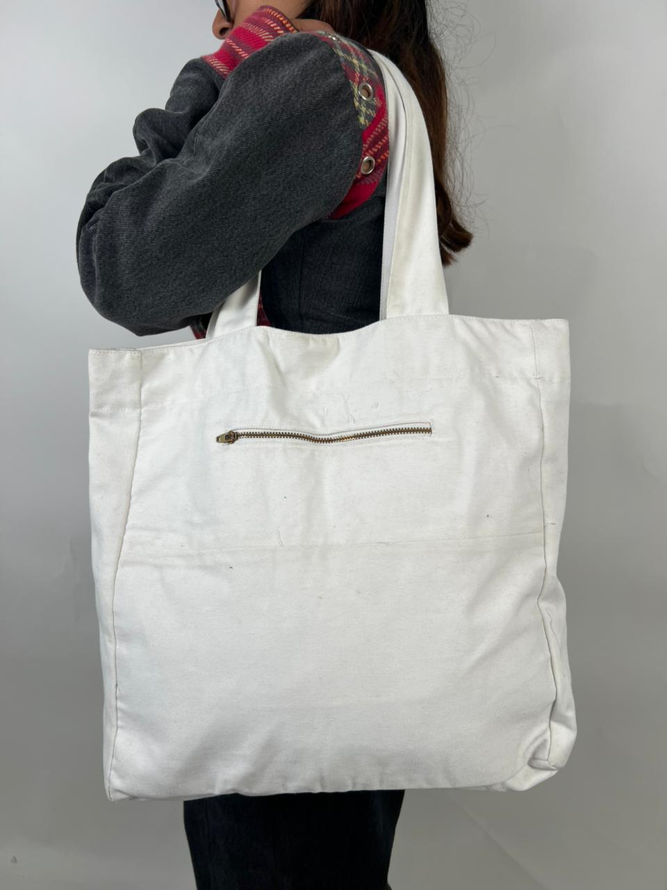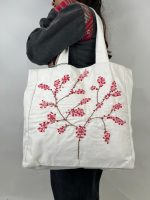 This bag, crafted from white Dickies denim pants, combines functionality with artistic elegance. The back features a zipper pocket, while the surface is adorned with delicate hand embroidery in a rich red floral design. The contrast between the crisp white denim and the vibrant embroidery creates a harmonious, sophisticated aesthetic. This fusion of sustainability and artistry makes for a timeless, stylish accessory that exudes class and grace.