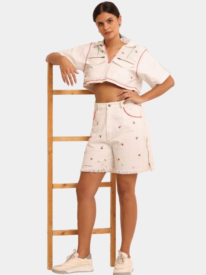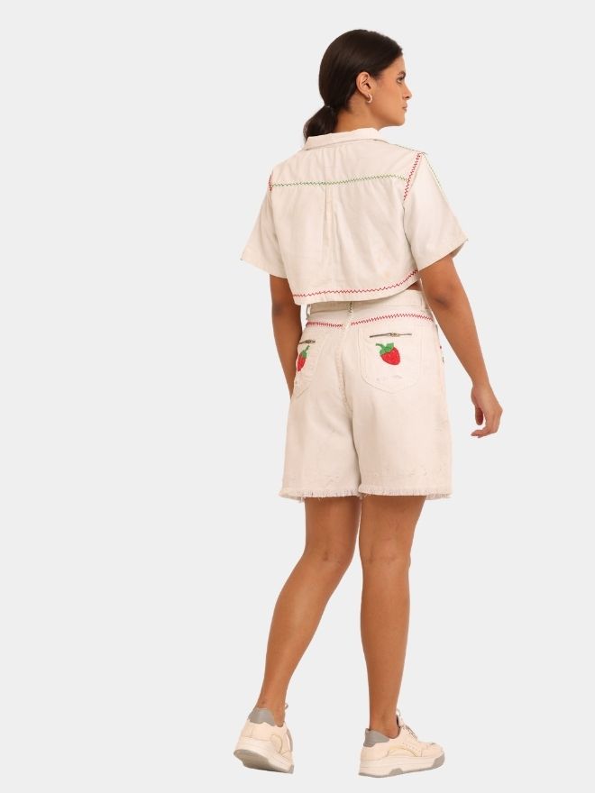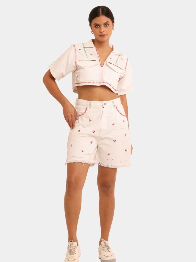The highlight of the design is the delicate hand-made cherry embroidery, thoughtfully placed to create a subtle yet playful all-over effect. Each embroidered motif reflects detailed artisanal work, adding personality and softness to the structured denim base.
