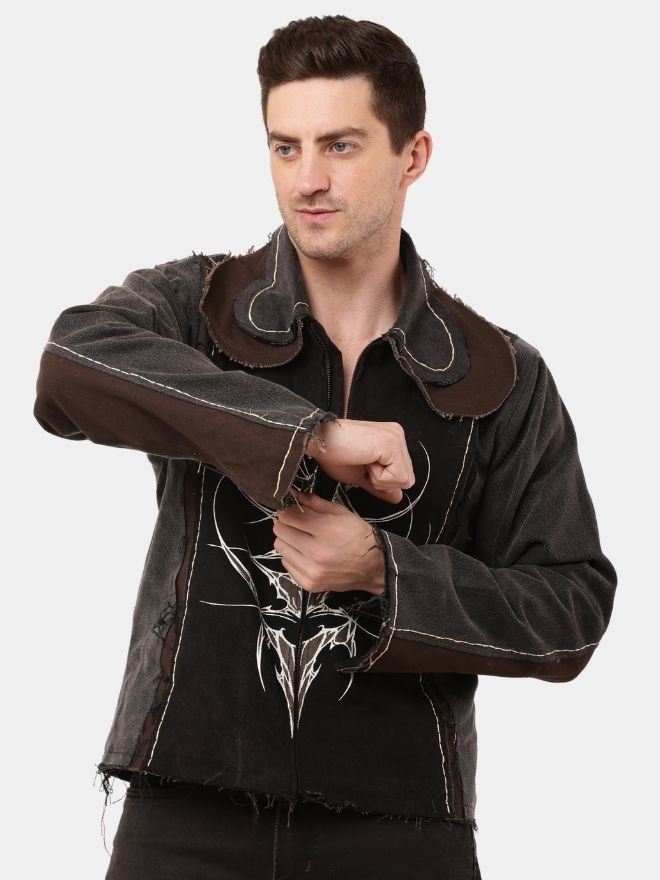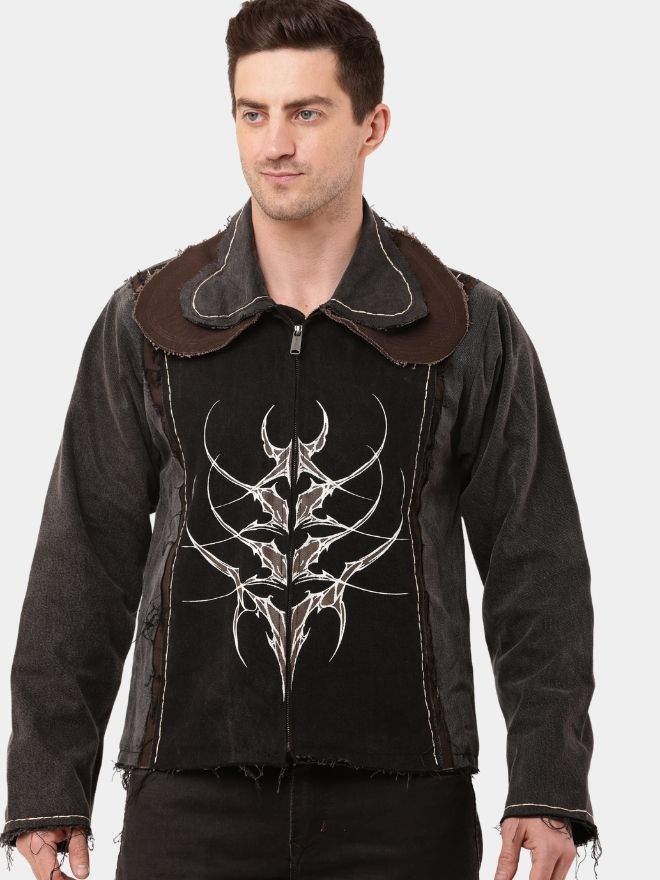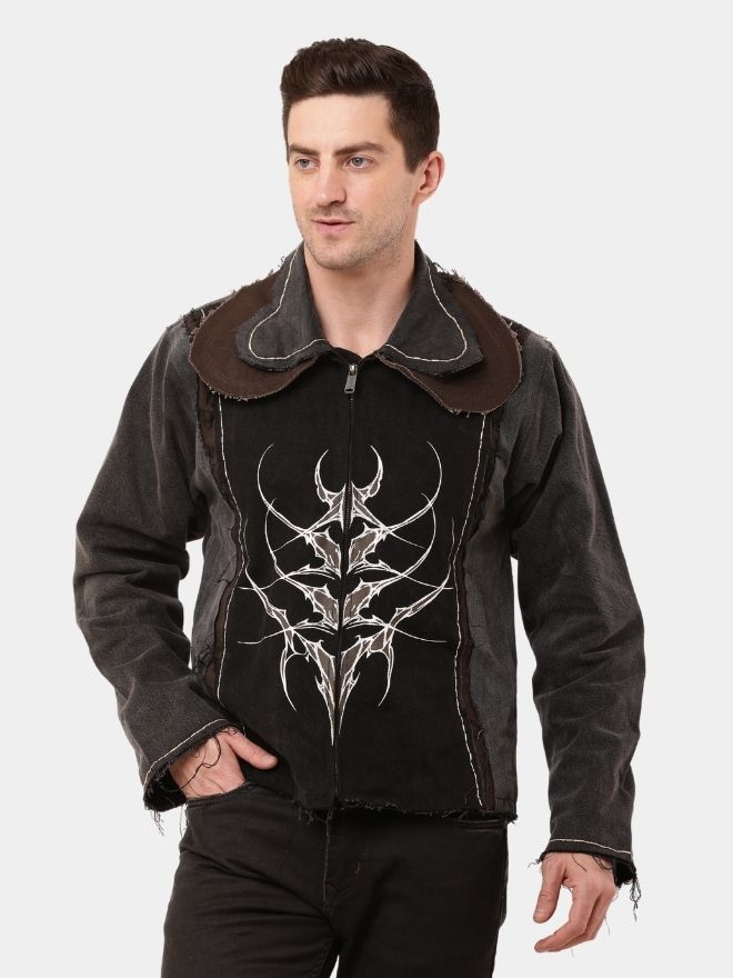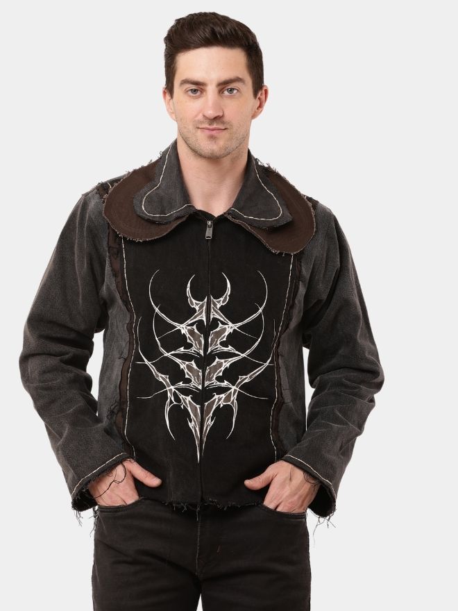 A bold unisex jacket crafted from repurposed denim and rugged canvas. Featuring a double-layered Peter Pan collar, cybersigilism screen prints, frayed edges, and hand-stitched detailing. Sizes XS–L.