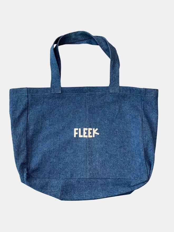 A stylish denim tote bag featuring “FLEEK” embroidery on the front, combining casual street style with a bold statement design.