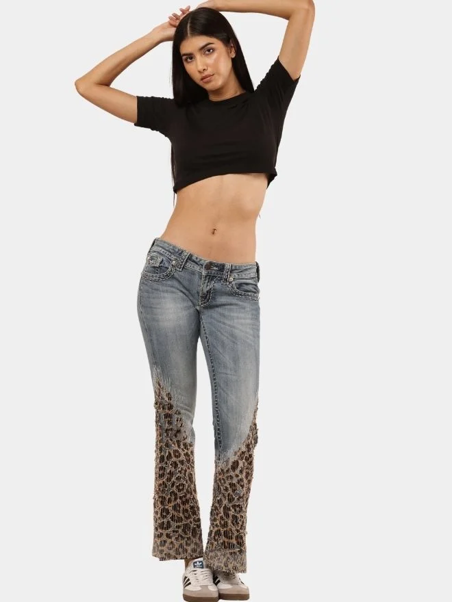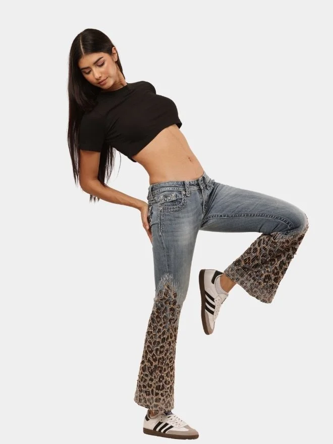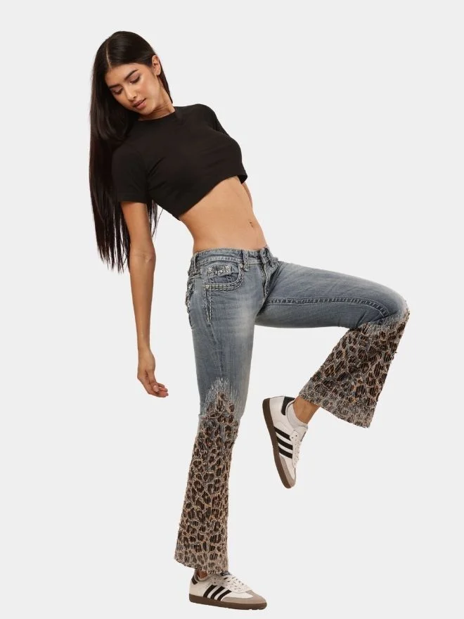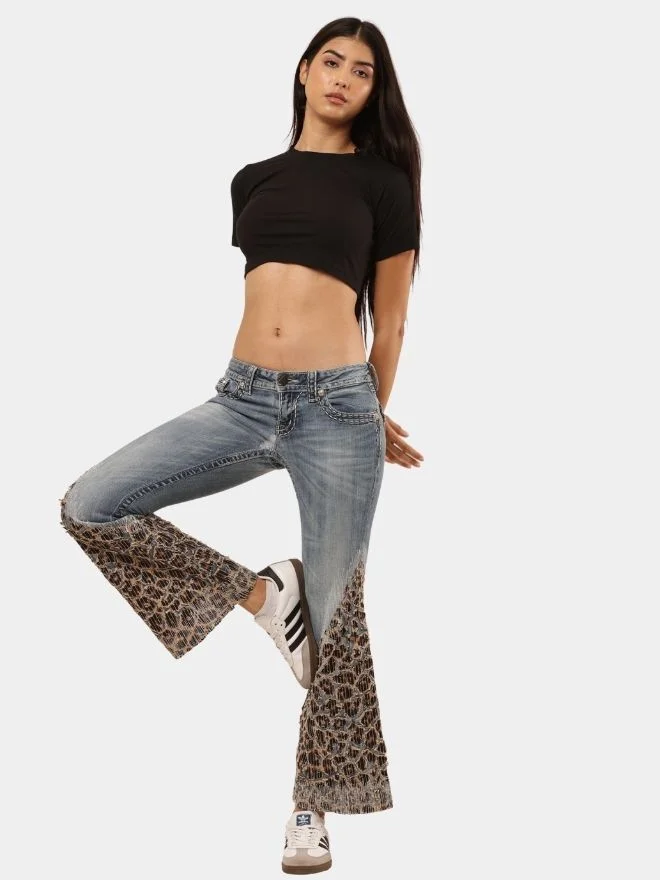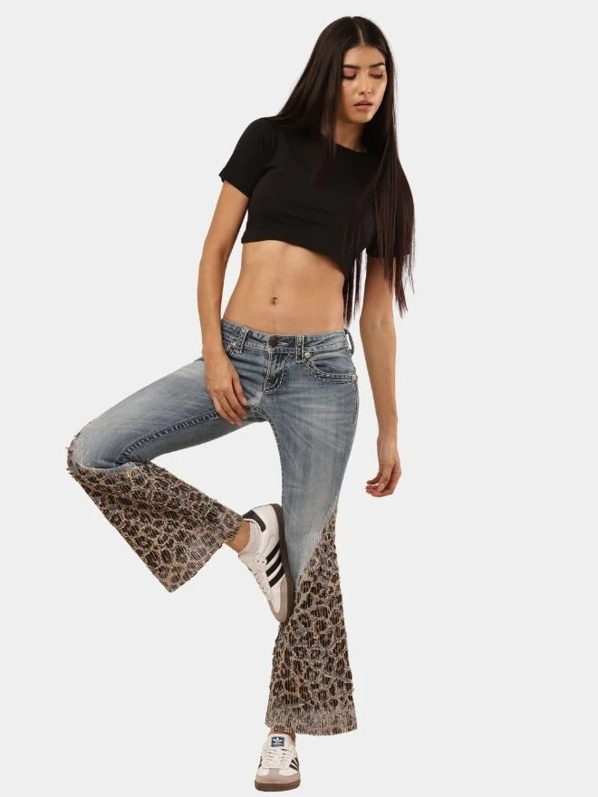 Vintage denim reimagined with bold leopard patchwork flares, blending classic structure with statement street style.