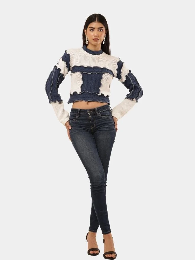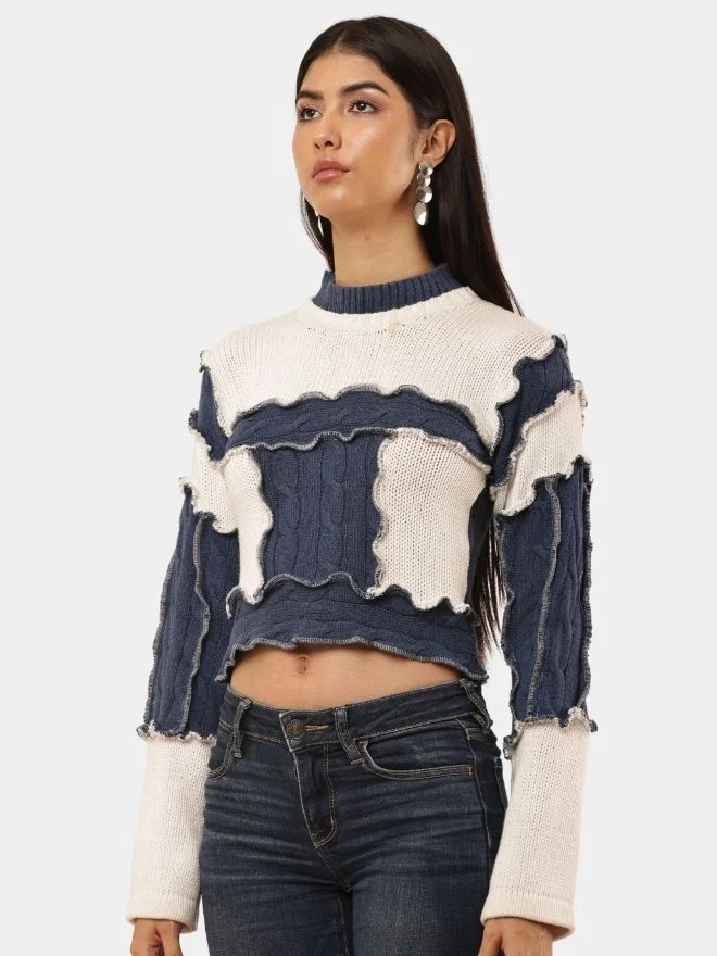 Featuring raw-edge patchwork panels across the front and sleeves, the top highlights an intentionally distressed aesthetic that celebrates imperfection and craftsmanship. The cropped fit adds a modern edge, while the high neckline and full sleeves balance the silhouette with a refined touch.