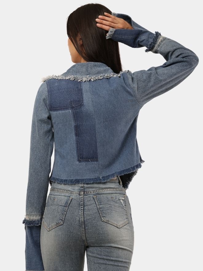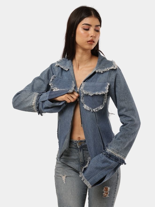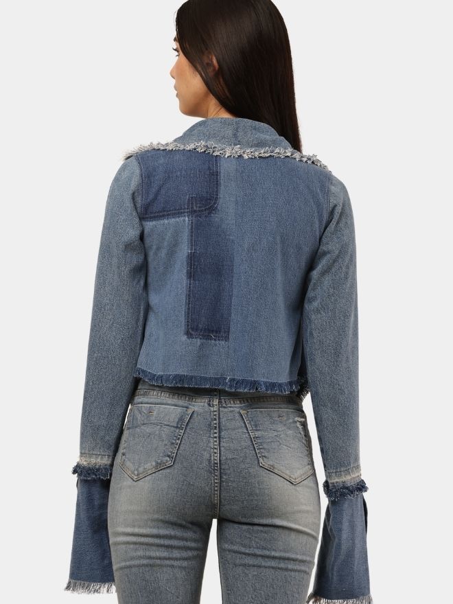 What truly sets this piece apart are the distressed frayed denim panels and pocket detailing, giving the garment a raw, edgy aesthetic. The statement flared cuffs add a dramatic silhouette to the sleeves, elevating the overall design and making the piece stand out.