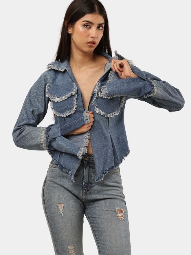 A bold reworked denim shirt featuring a front zipper closure, convertible collar, frayed pocket detailing, and statement flared cuffs. Crafted from recycled denim for a unique blend of sustainability and street-style fashion.