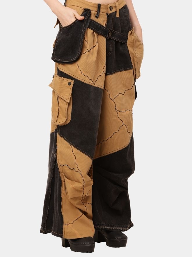 A versatile upcycled cargo pant crafted from black denim and tan canvas. Featuring detachable pocket detail, hand embroidery, cargo utility pockets, and belt embellishment. Baggy bootcut fit. Sizes 26–34.