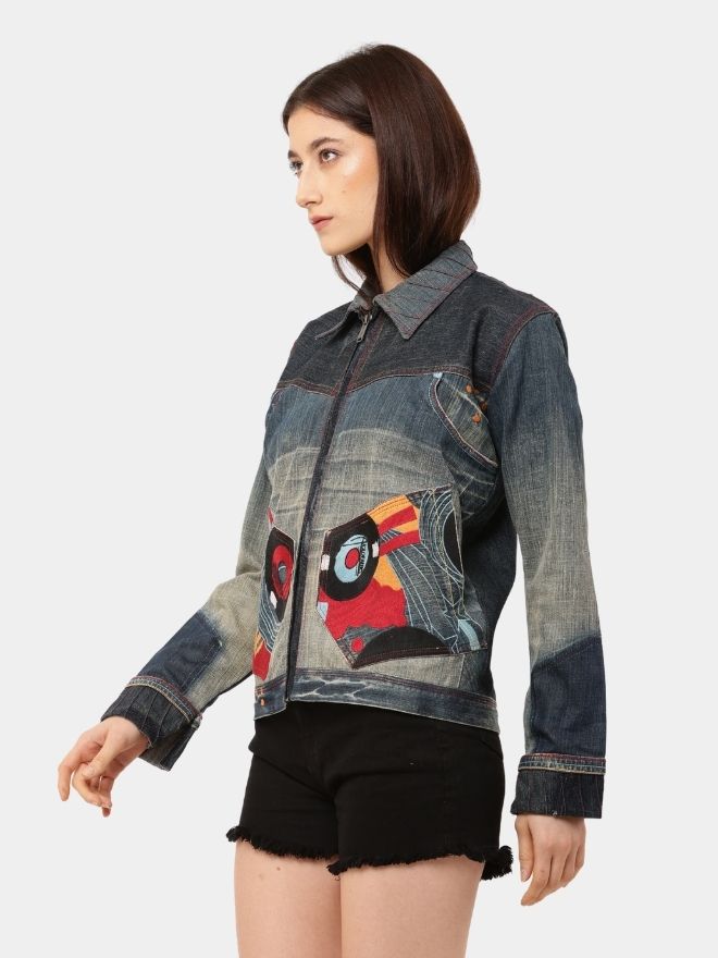 Japanese embroidery denim patches bring refined craftsmanship into the design, while subtle graphic elements enhance its bold, artistic identity. The fusion of reconstructed denim, detailed stitching, and timeless fabric makes this jacket a strong representation of individuality and sustainability.