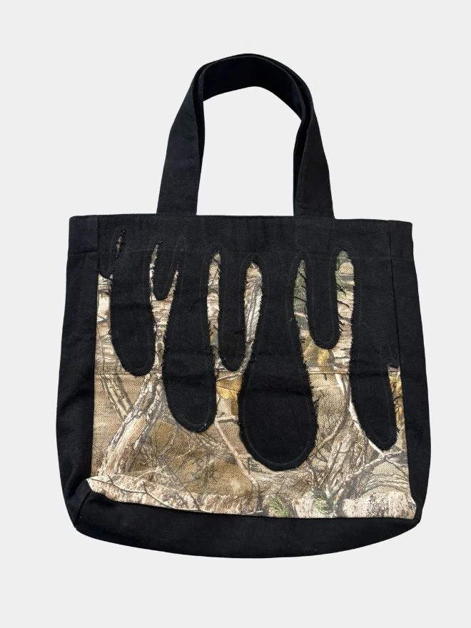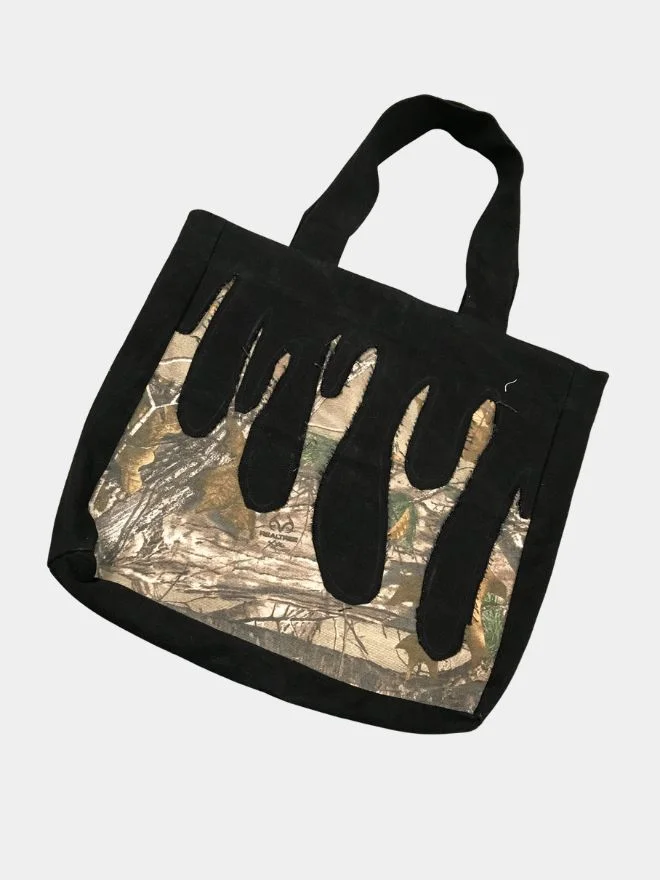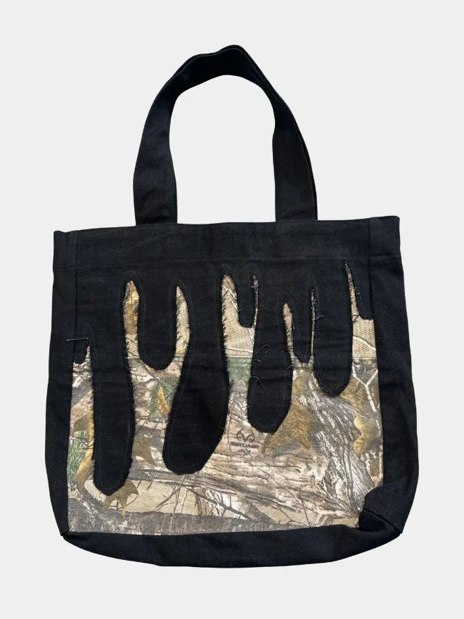 The Drooping Tote Bag blends classic denim heritage with outdoor-inspired edge. Crafted from vintage black denim jeans and paired with Realtree camouflage fabric, this tote delivers a distinctive fusion of urban attitude and nature-driven aesthetics.