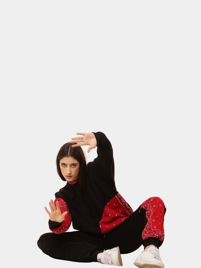 A bold fleece sweatshirt and pant set featuring asymmetric bandana appliqué, circular patch cut-outs, and fishtail back detail. Baggy unisex fit built for comfort and street impact. Sizes 26–36.