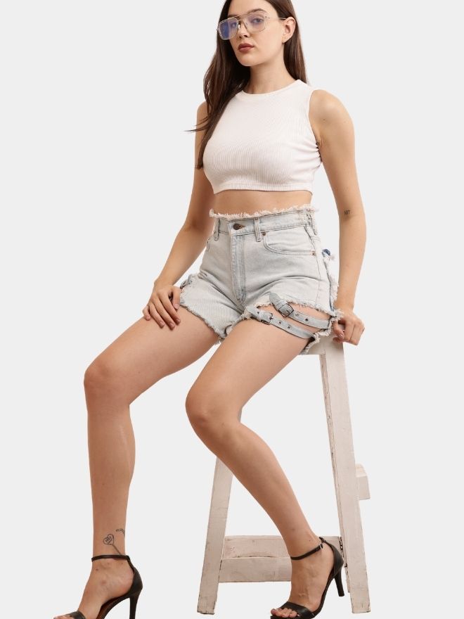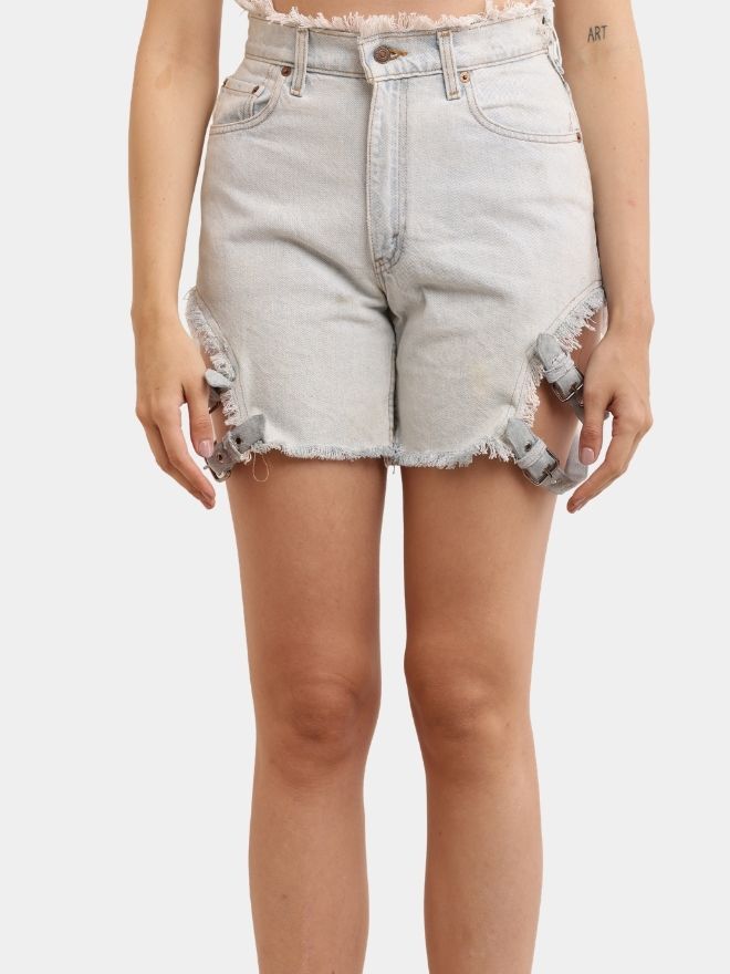 The standout frayed hem and distressed waist belt create a lived-in, rebellious aesthetic. Adding to the unique design, two adjustable belts are placed on one side of the hem — introducing asymmetry, structure, and styling versatility.