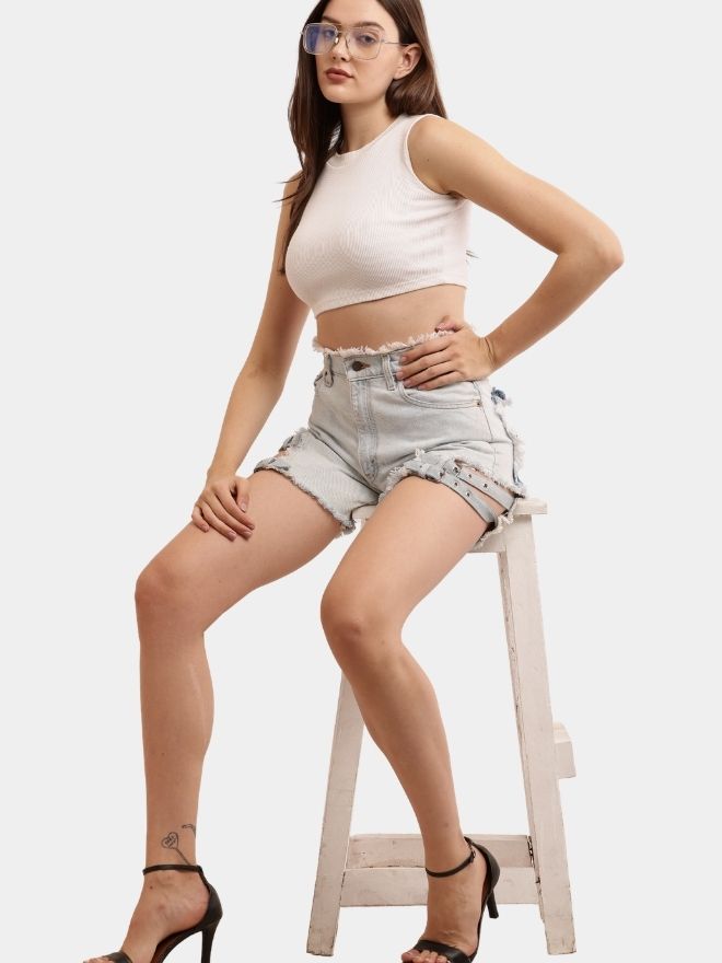 Cut in a regular fit with an above-the-knee length, these shorts balance comfort with statement appeal. The structured denim base keeps the silhouette strong, while the frayed detailing softens the finish with texture and movement.