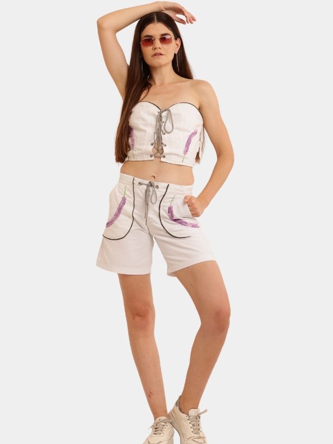 The matching shorts continue the theme with embroidered accents and functional pockets, making the set both stylish and practical. Perfect for summer styling, streetwear looks, vacations, or standout everyday outfits.