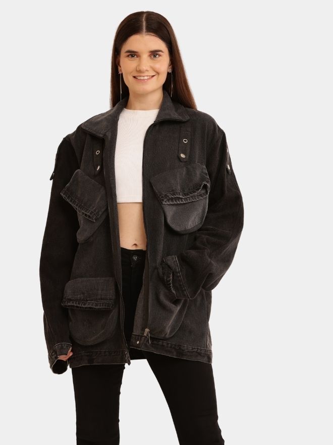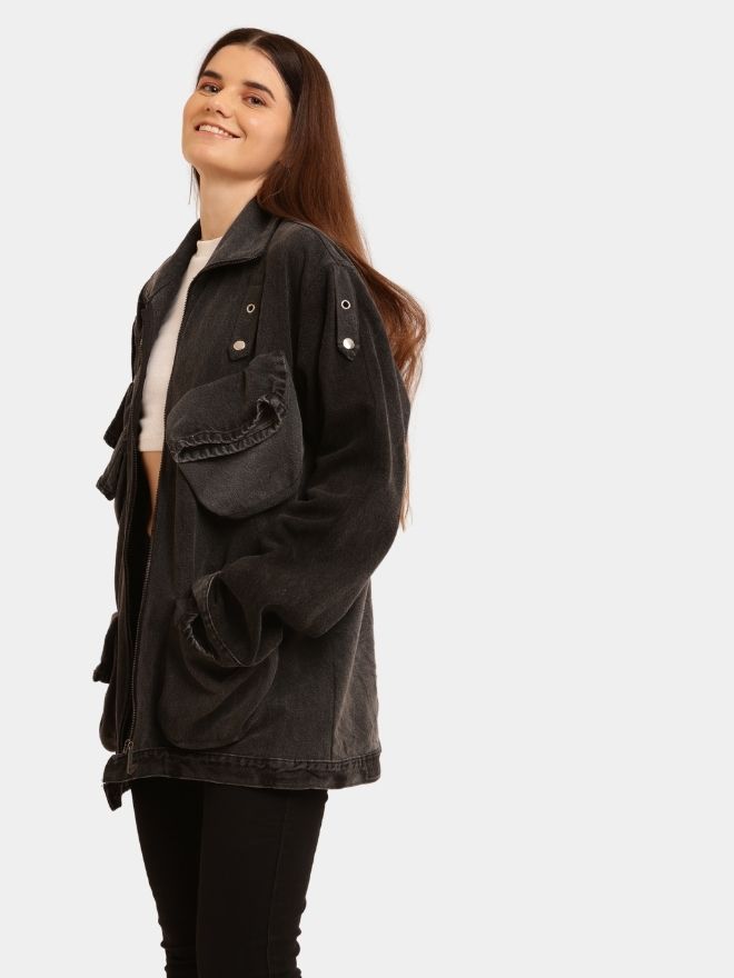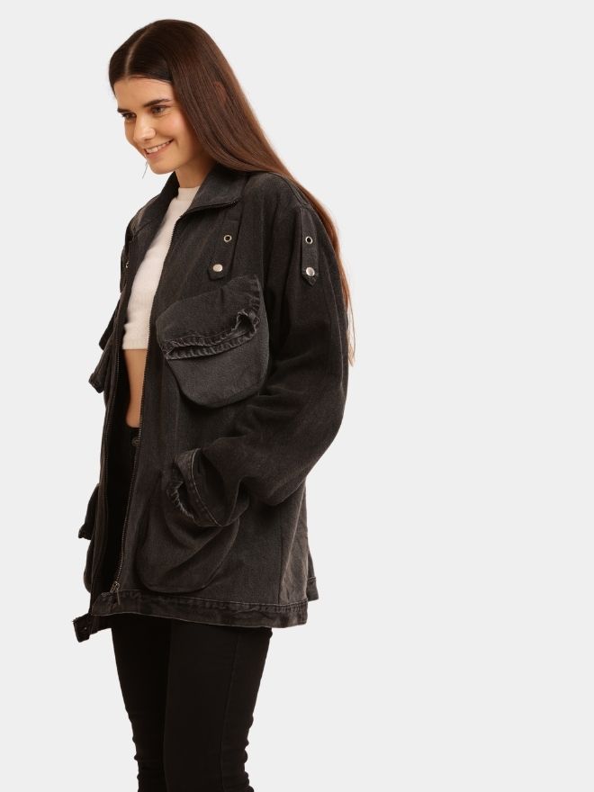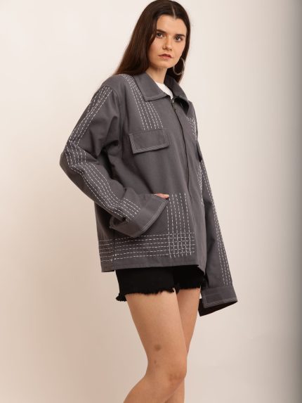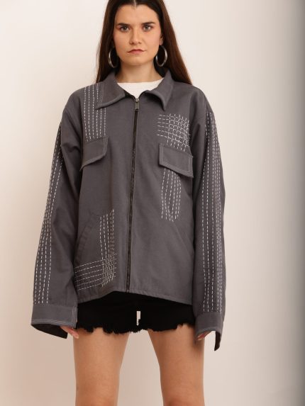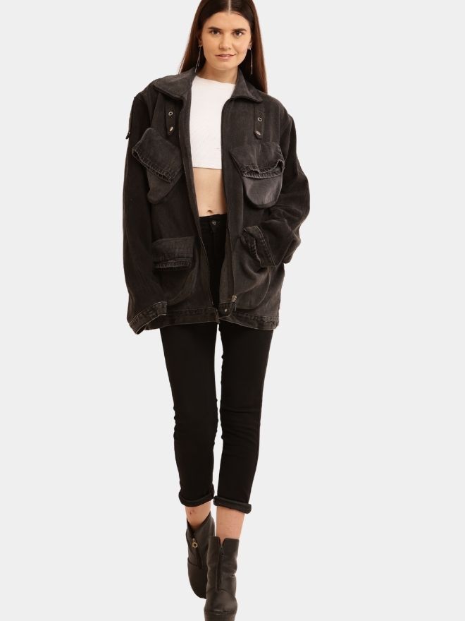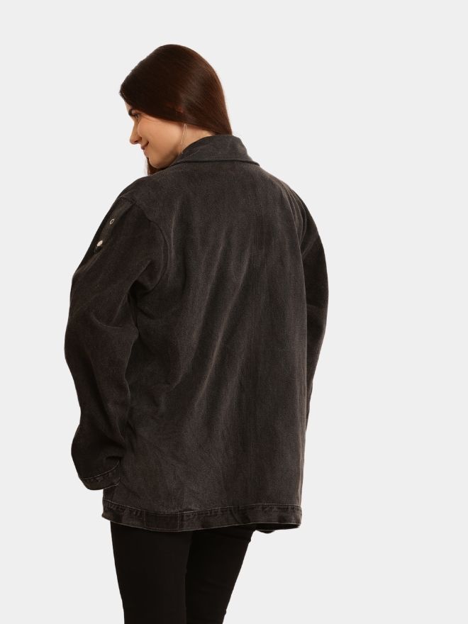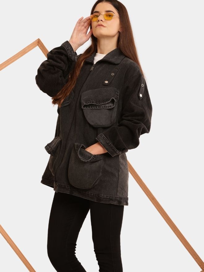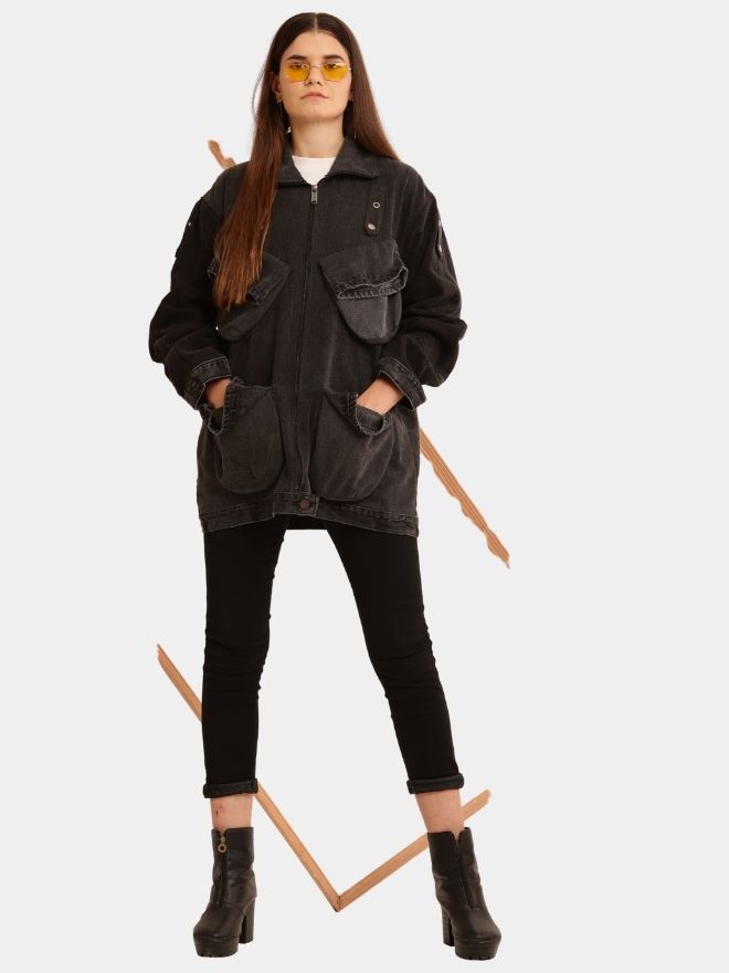 One of the most striking features is the pockets crafted from the original pant hems, adding an unexpected design element while maintaining practicality. The oversized denim structure gives the jacket a relaxed and comfortable fit, perfect for everyday wear.