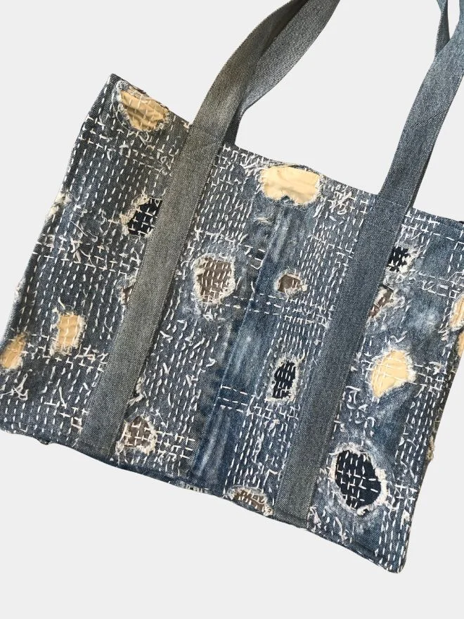 A handmade Boro-style patchwork tote bag crafted from upcycled denim, featuring traditional sashiko-inspired stitching and a textured layered design.