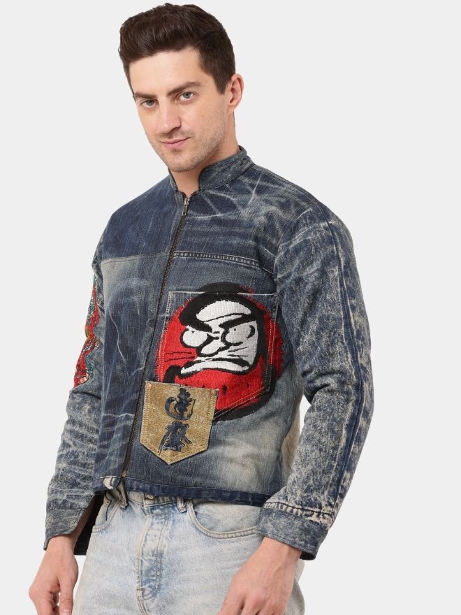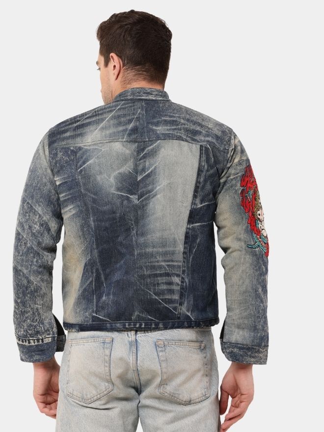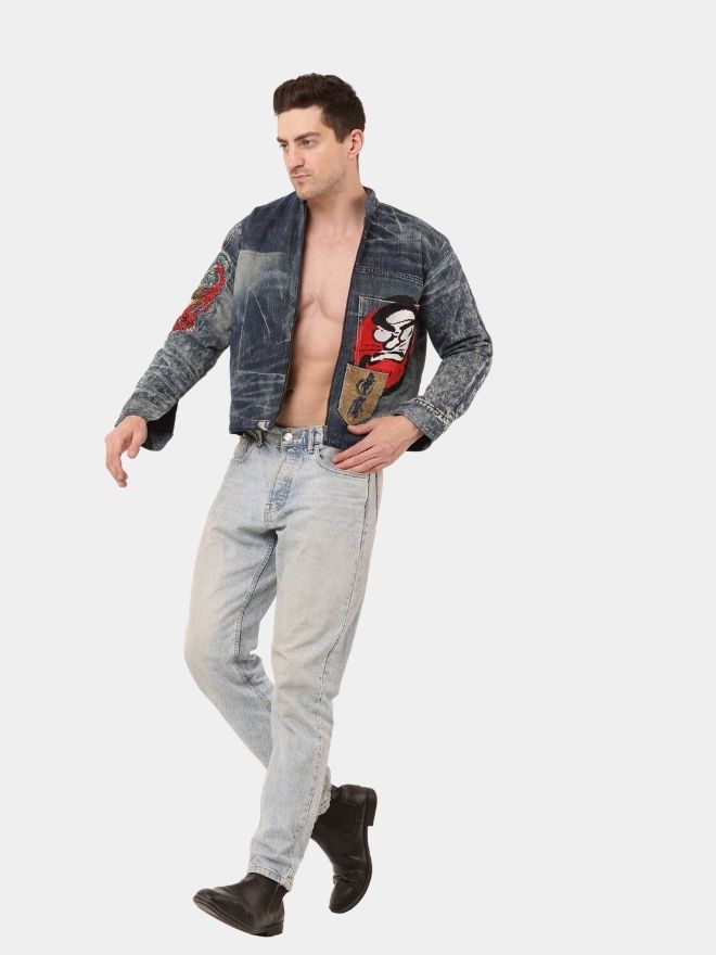 Features: Distressed wash, Daruma back motif, sleeve patchwork, Nehru collar