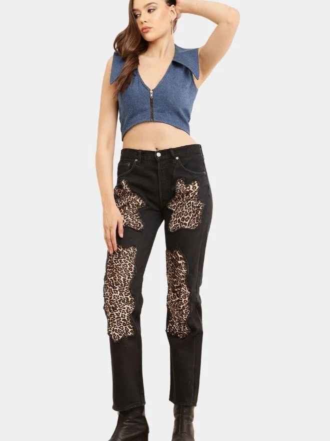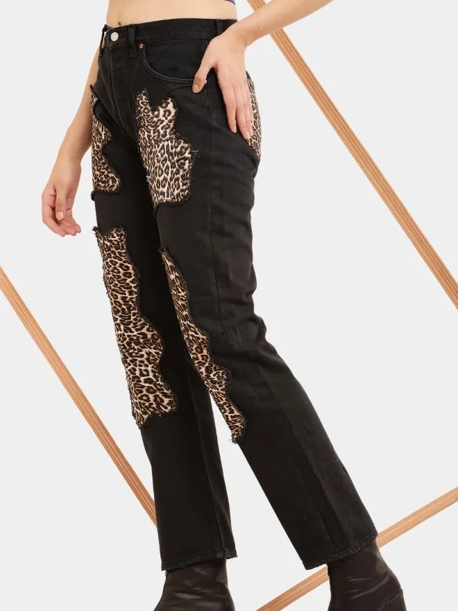 The Leopard Jean is a distinctive reworked denim piece inspired by the timeless appeal of leopard print. Crafted from vintage denim, the jeans are enhanced with carefully placed leopard print satin poly fabric patches that add a striking contrast to the rugged denim base.