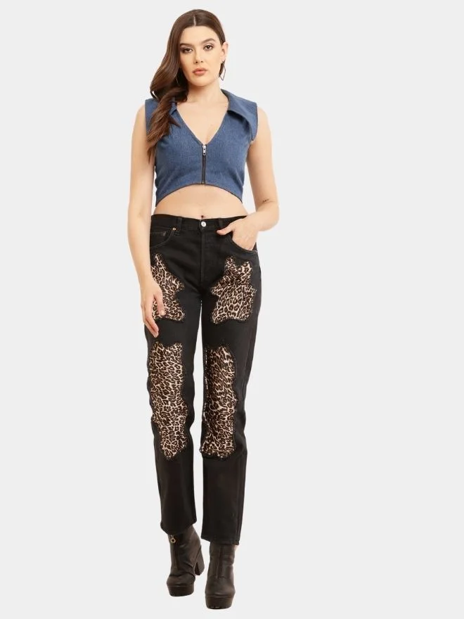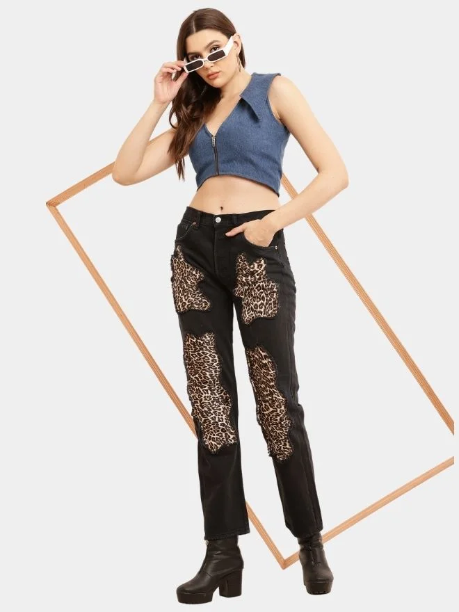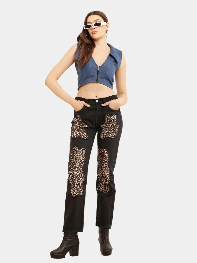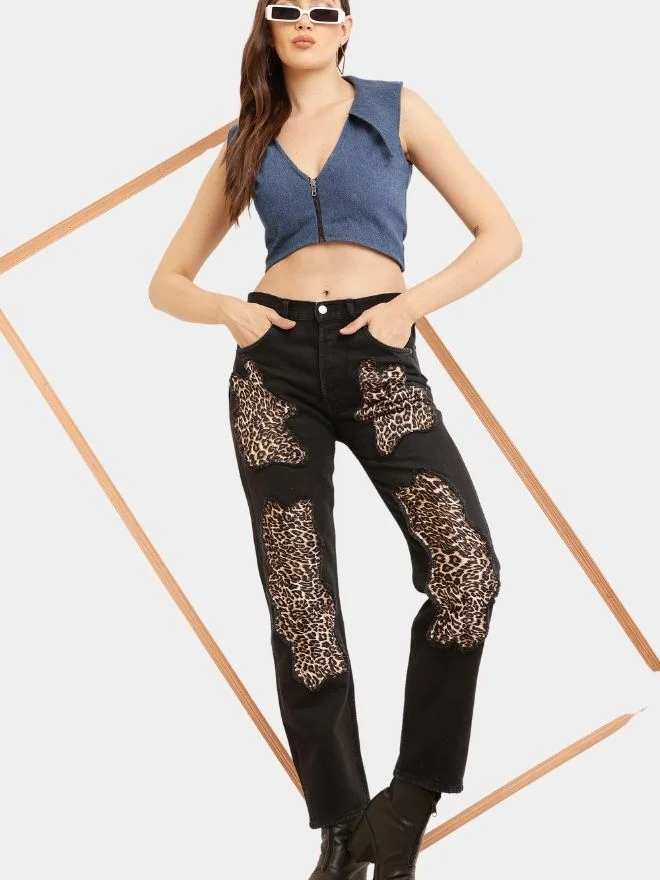 The result is a pair of jeans that feels both bold and sophisticated. The leopard elements elevate the denim, giving it a classy and aesthetically pleasing look while maintaining the authenticity of vintage reworked fashion.