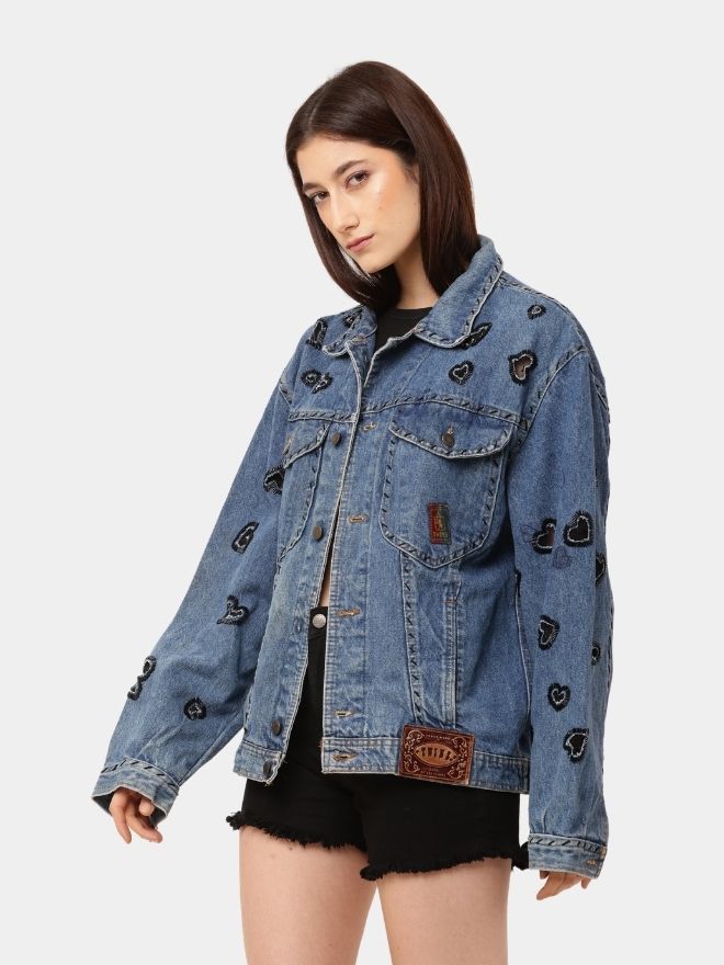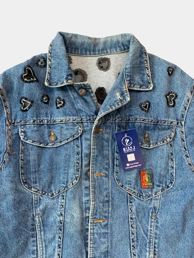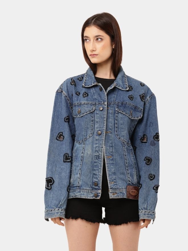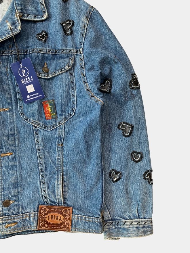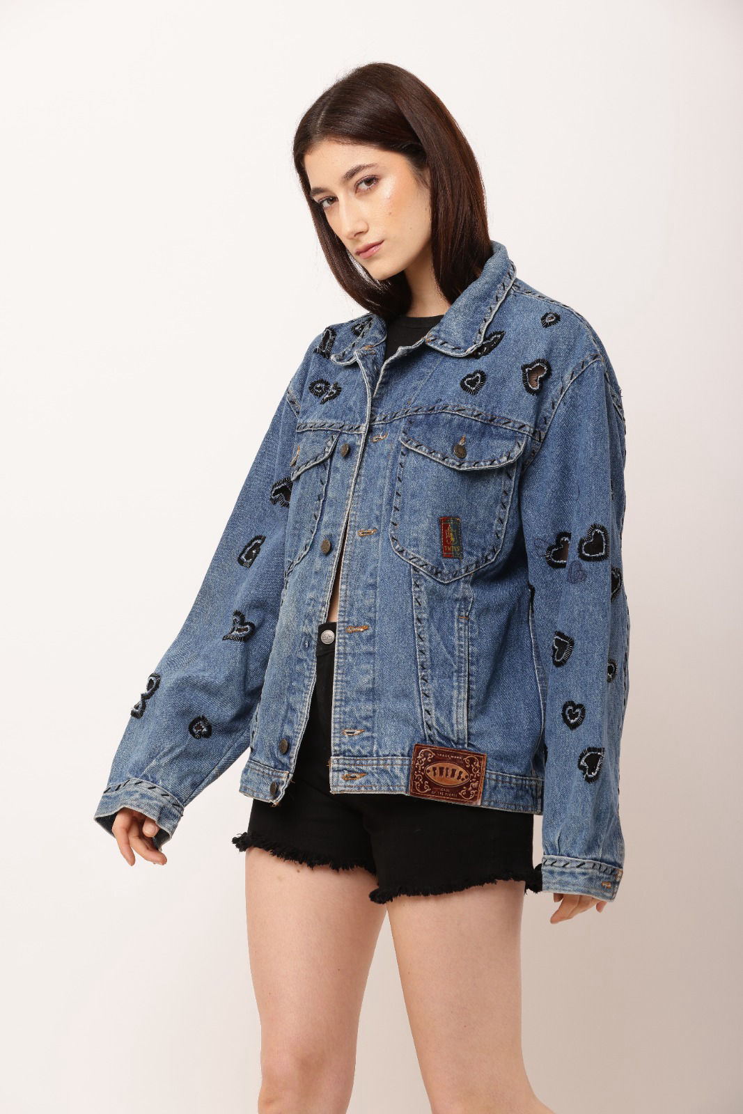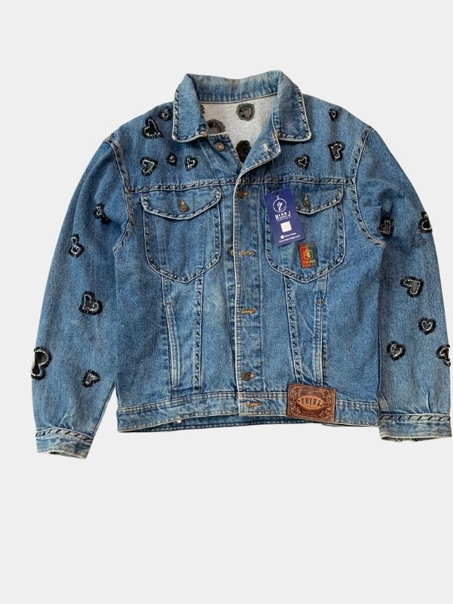 This stunning jacket features a bold rework design, with a heart-shaped cutout that creates a striking focal point. Behind the cutout, mesh fabric is carefully placed from the inside, adding depth and texture to the piece. To secure the mesh, intricate Kundana work is meticulously embroidered all around the heart-shaped cutout, creating a beautiful contrast between the delicate mesh and the ornate stitching. The combination of modern design and traditional craftsmanship makes this jacket a truly unique and eye-catching garment, perfect for adding a touch of artistry and elegance to any outfit.