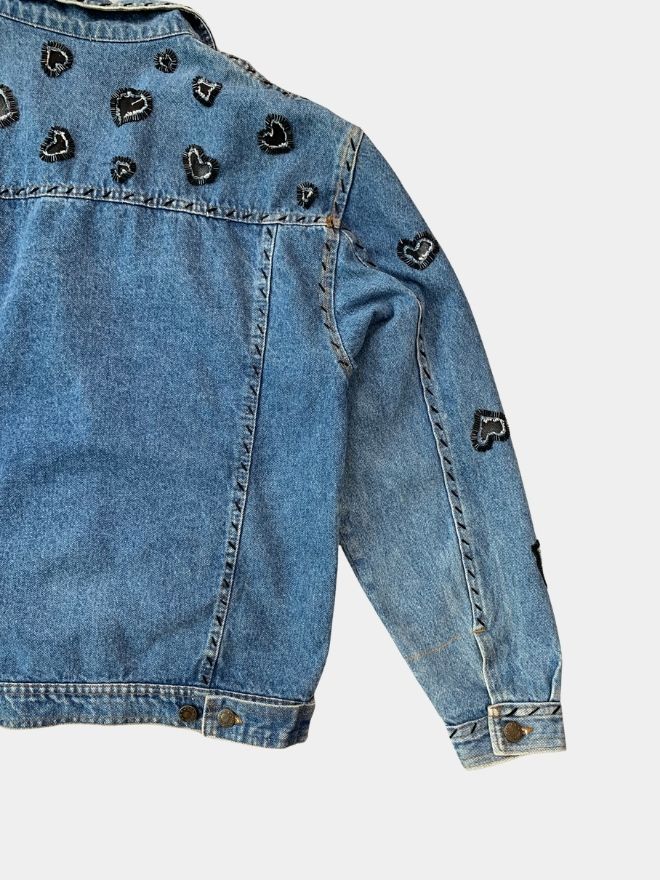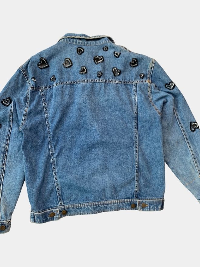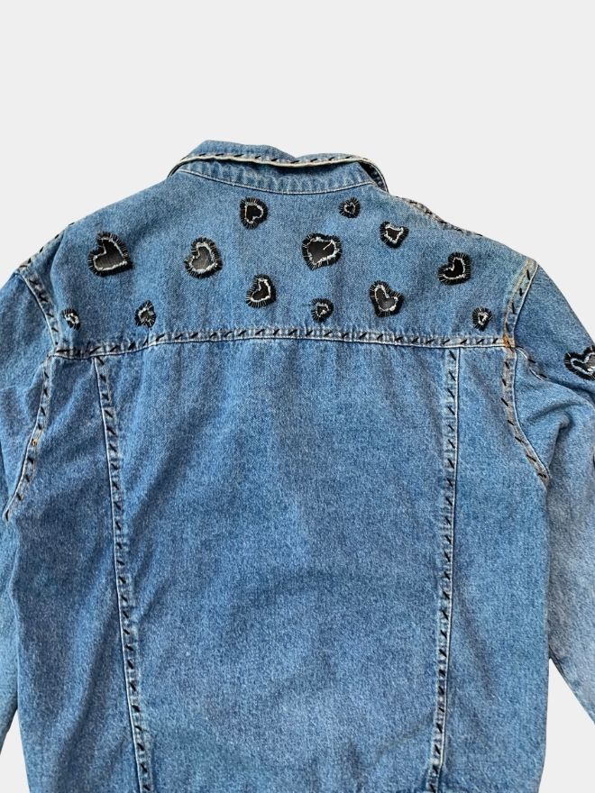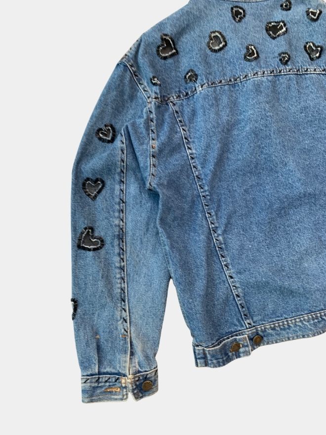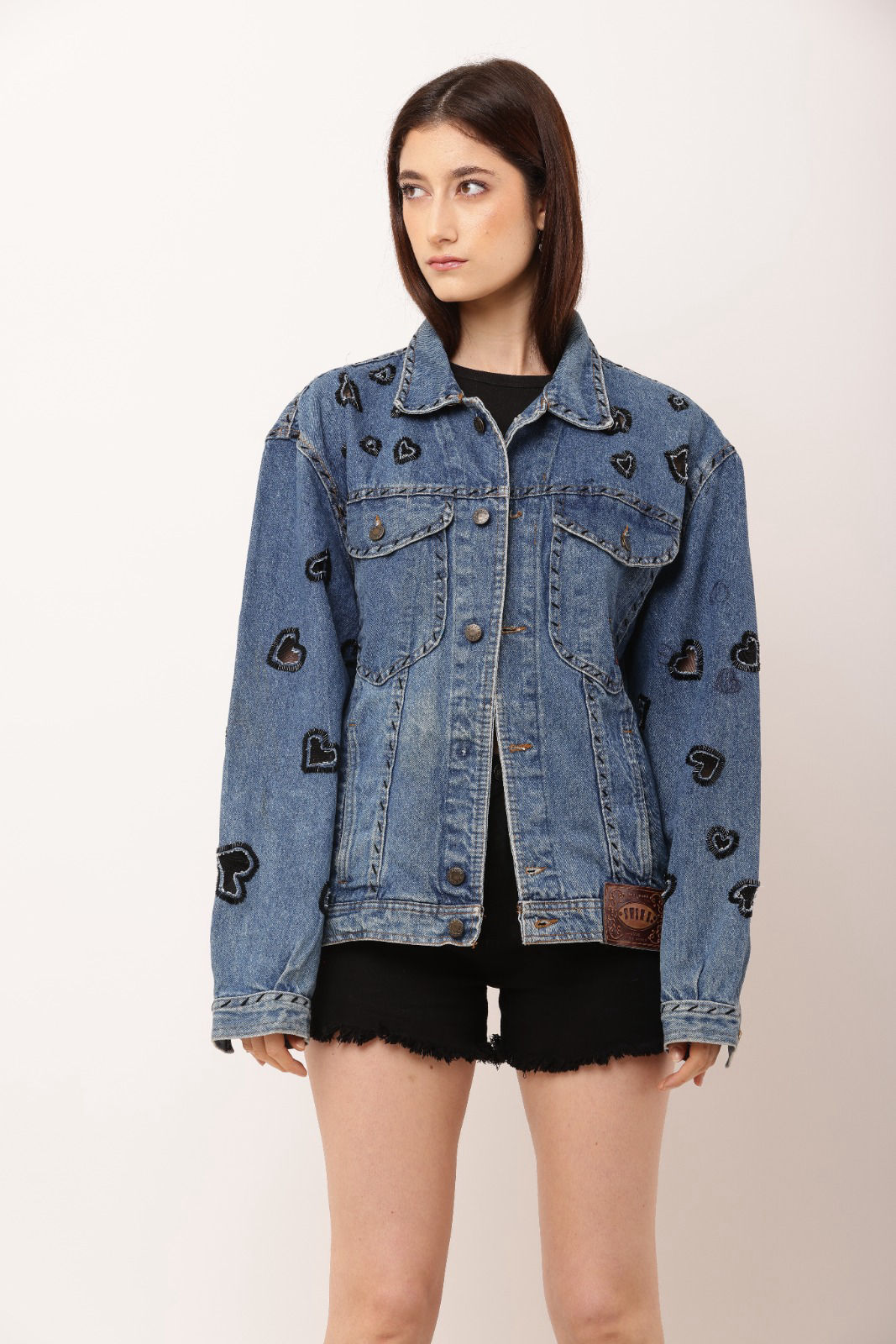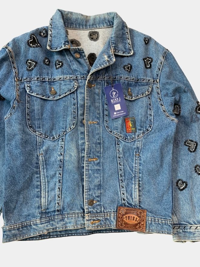 This stunning jacket features a bold rework design, with a heart-shaped cutout that creates a striking focal point. Behind the cutout, mesh fabric is carefully placed from the inside, adding depth and texture to the piece. To secure the mesh, intricate Kundana work is meticulously embroidered all around the heart-shaped cutout, creating a beautiful contrast between the delicate mesh and the ornate stitching. The combination of modern design and traditional craftsmanship makes this jacket a truly unique and eye-catching garment, perfect for adding a touch of artistry and elegance to any outfit.