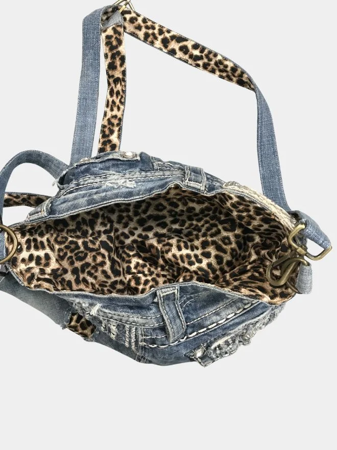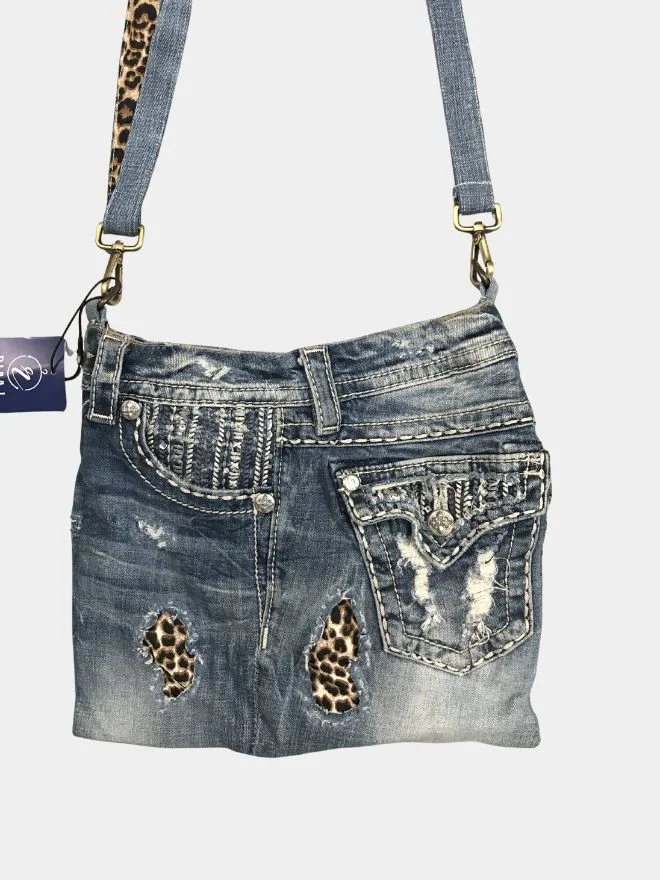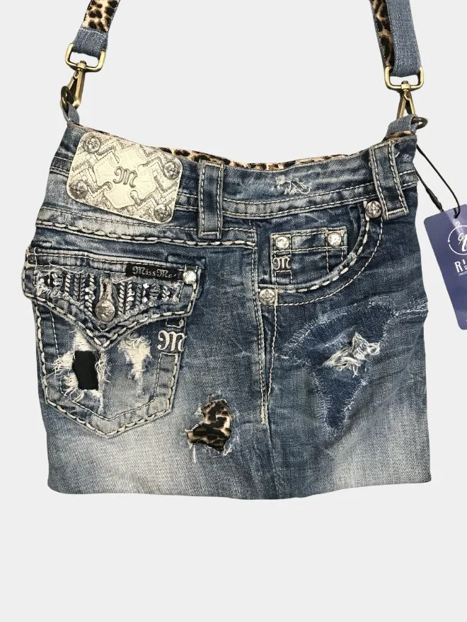 A bold reworked shoulder bag crafted from authentic Miss Me denim jeans, featuring distressed details, signature embellishments, and a standout leopard-print strap.