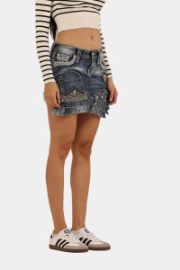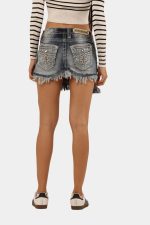 Upgrade your denim game with this one-of-a-kind Miss Me reworked mini skirt. Crafted from discarded Miss Me jeans, each skirt is uniquely designed using the original front pockets as eye-catching surface embellishments. The skirt showcases authentic denim distressing, detailed stitching, and a frayed hem for a bold, lived-in look. Perfect for pairing with sneakers or heels, this mini skirt adds a touch of edgy luxury to any outfit.