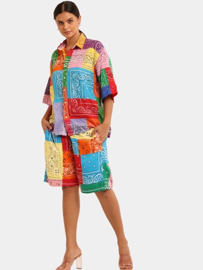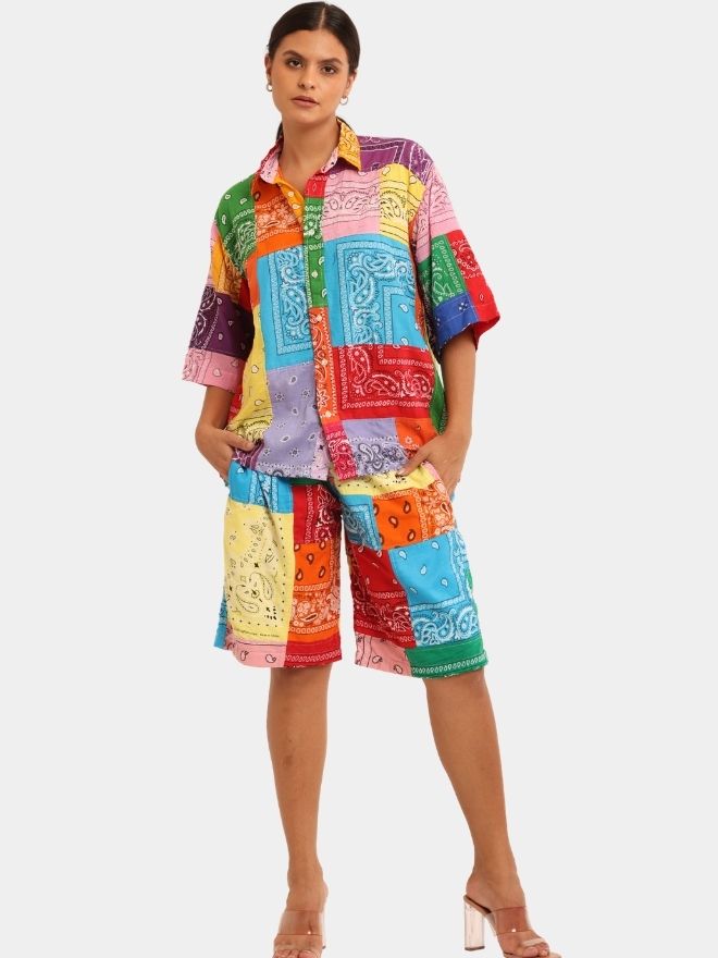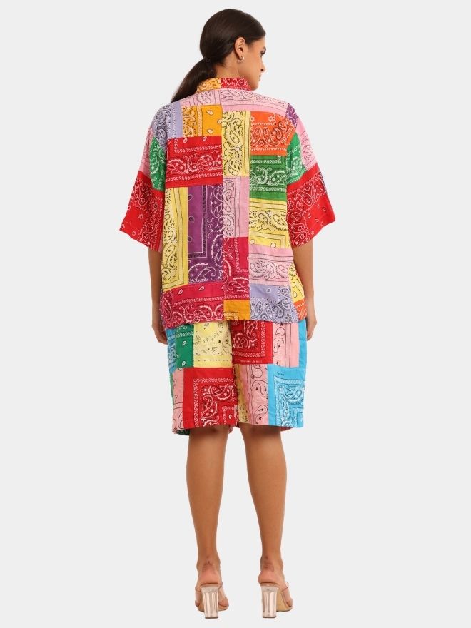 This Bandana Patchwork Co-Ord Set is crafted from vibrant cotton bandana handkerchiefs, carefully combined to create a striking multicolor patchwork composition. Each panel showcases classic bandana motifs, reimagined into a cohesive and expressive design.