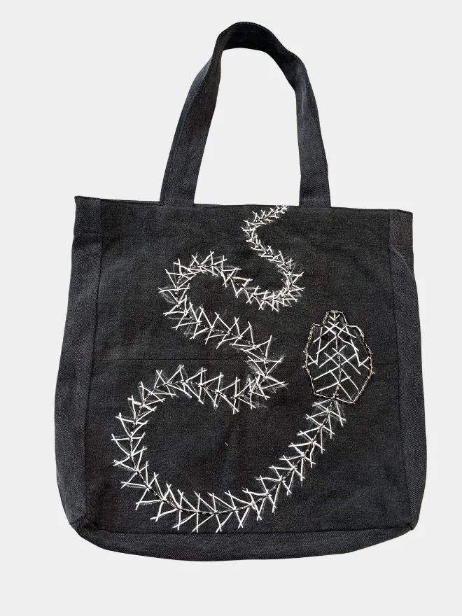 The Noir Snake Tote is a striking expression of transformation and individuality. Crafted from old vintage black denim, this bag reimagines reclaimed fabric into a statement accessory rooted in art and sustainability.