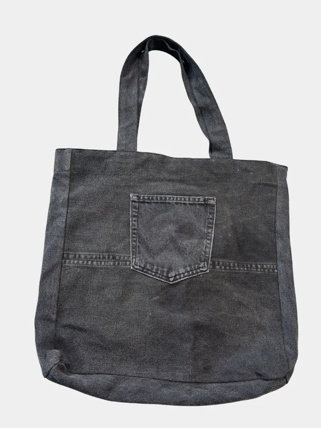 The original denim pocket is intentionally preserved, highlighting the garment’s past life while reinforcing the bag’s sustainable foundation. This thoughtful reworking celebrates craftsmanship, authenticity, and artistic storytelling in every stitch.