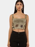 Exclusive 1-of-1 upcycled corset-style crop top made from an original Harley-Davidson T-shirt and Realtree camo pants. Features a fitted silhouette with adjustable straps. Handmade, sustainable, and truly unique. Size Medium. Only one available.