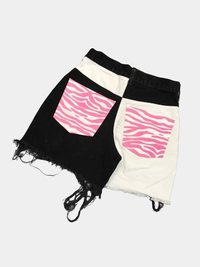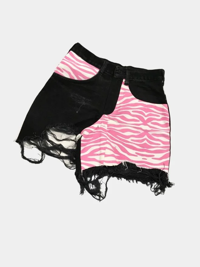 A playful summer co-ord crafted from vintage Lee, Levi’s, and Wrangler black denim. Featuring a bold pink zebra screen print, a reconstructed bra top with denim belt closure, and distressed shorts, this set blends sustainability with youthful street style. 🦓🌸♻️