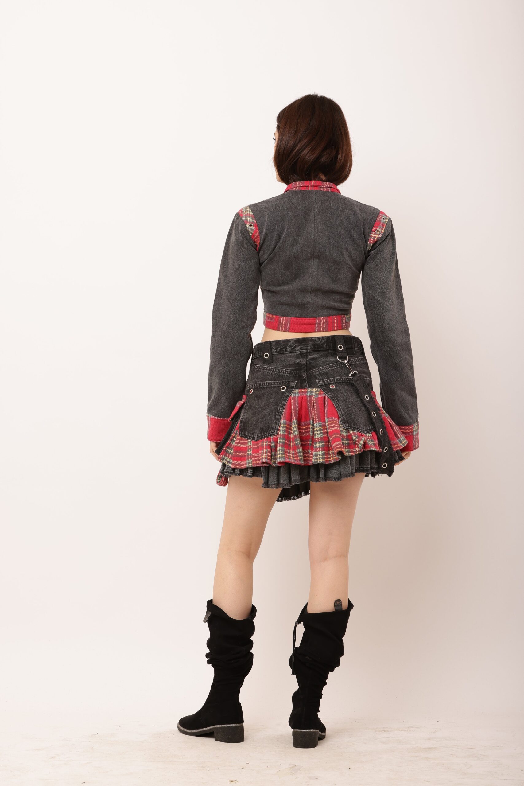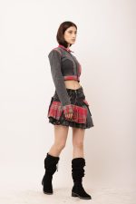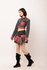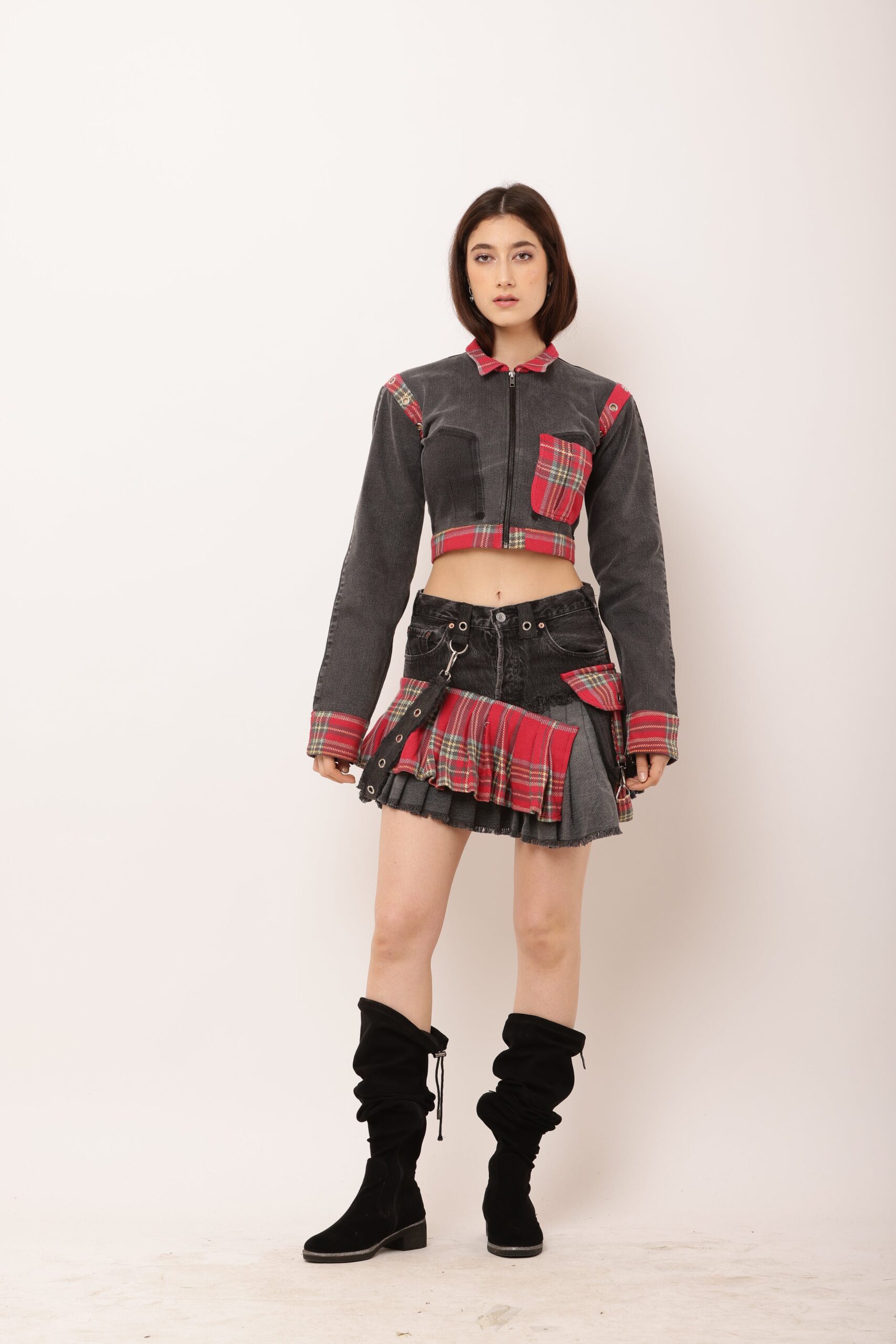 This bold and edgy co-ord set is a testament to sustainable fashion, showcasing upcycled creativity. The top is crafted from an old checkered shirt and denim remnants, merging a punk aesthetic with tailored streetwear vibes. The skirt, reimagined from vintage denim jeans and accented with checkered pleats, adds a playful yet rebellious edge. Functional details like metallic buckles and adjustable straps complete the look, making it versatile and chic for urban explorers.