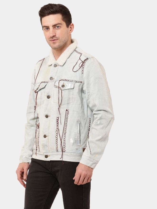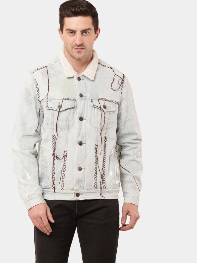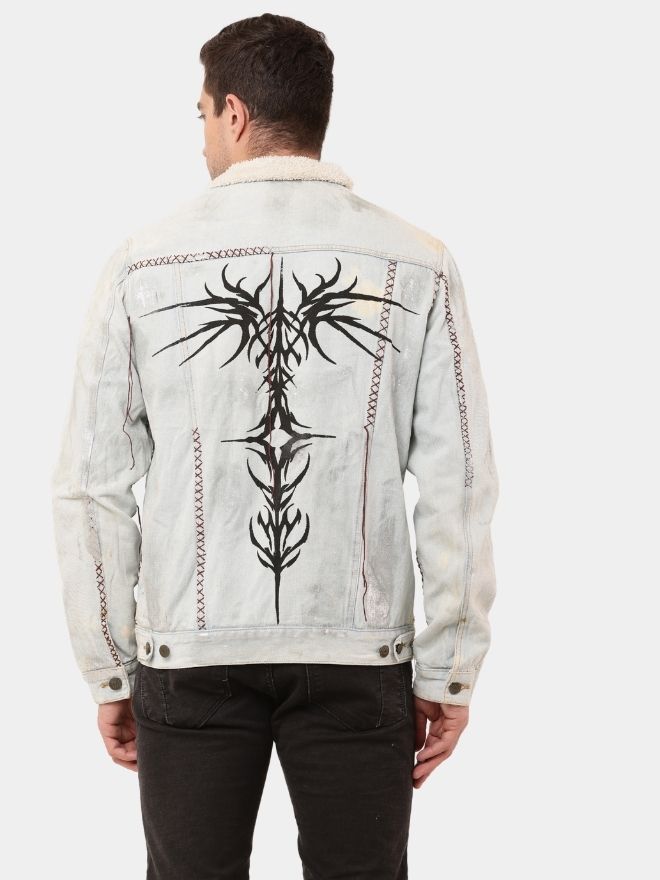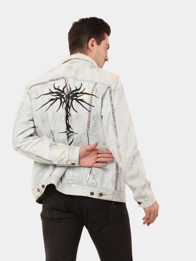 A regular-fit men’s denim jacket featuring hand-embroidered detailing, Cybersigilism screen print at the back, and an all-over foil finish with sherpa lining. Sizes XS–L.