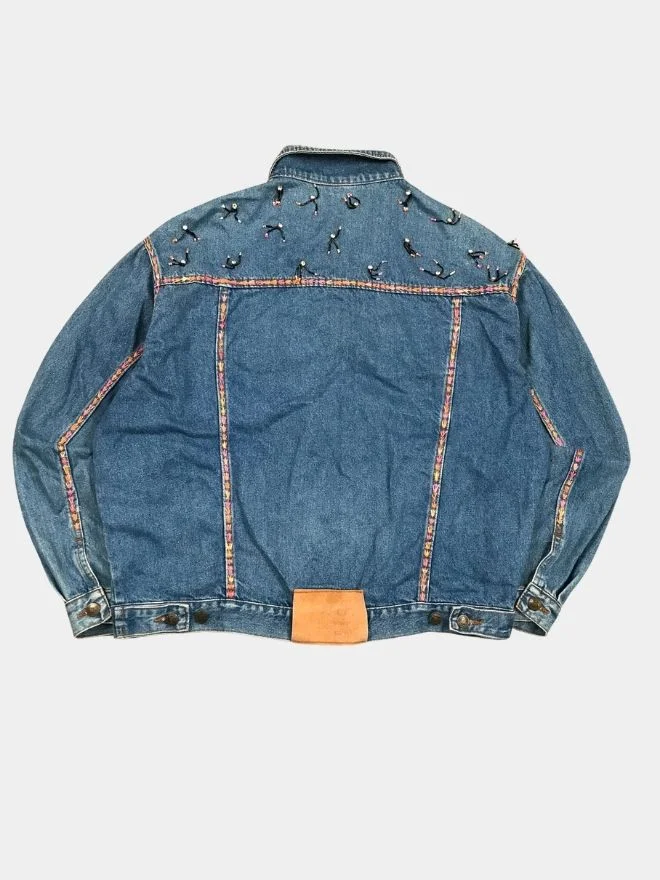 Each stitch celebrates the process of rebuilding and reimagining denim. Rather than hiding the seams, the design emphasizes them, making the structure of the jacket part of the art.