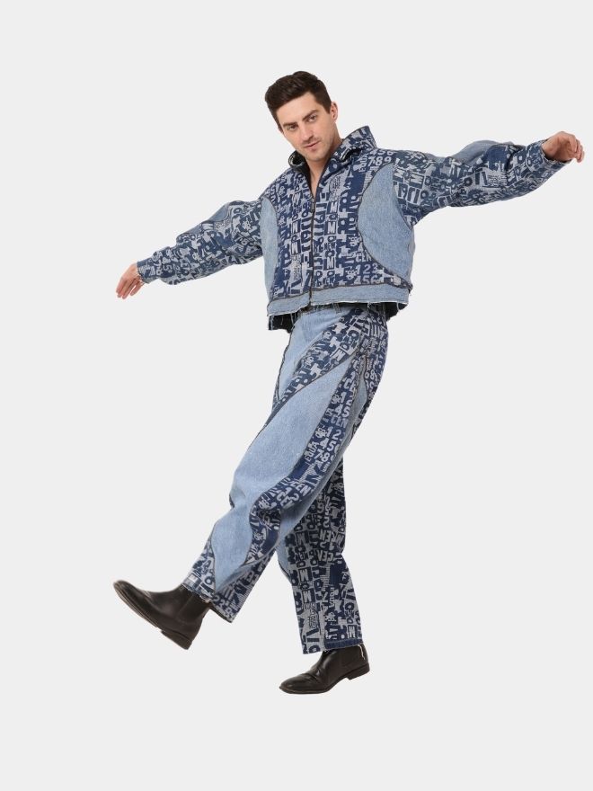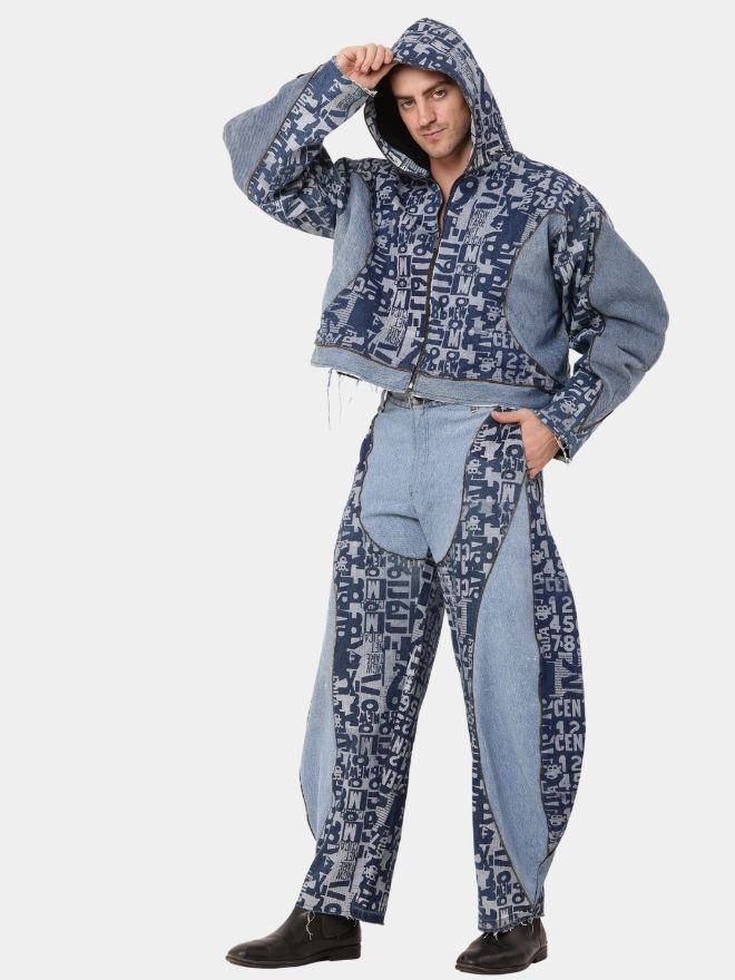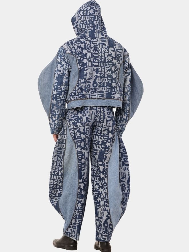 Selective typography screen prints add a bold graphic edge without overwhelming the design, creating a balanced yet expressive aesthetic. The structured jacket delivers sharp presence, while the relaxed balloon pants bring movement and comfort. Industrial chain detailing enhances the urban attitude, giving the ensemble a raw, street-driven identity.