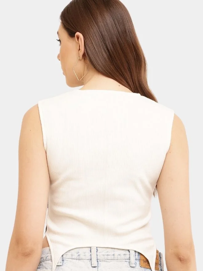 Complementing the jeans is a cut-out sleeveless knit top, crafted from a mix of black and white knitted fabrics. The contrast of colours creates a visually striking look while maintaining a clean and refined silhouette. The cut-out detailing adds a contemporary edge, balancing the ruggedness of the denim with a more structured and stylish top design.