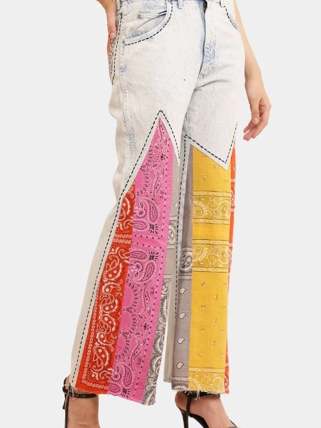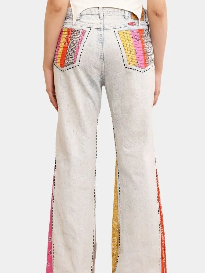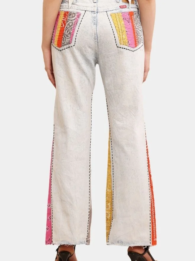The denim jeans, originally from the renowned brand Wrangler, are creatively reworked to introduce new visual elements while preserving the rugged authenticity of vintage denim. A carefully placed bandana print panel adds contrast and character to the jeans, giving them a distinctive patchwork aesthetic. The bandana fabric is further enhanced with meticulous hand embroidery using a running stitch, emphasizing the craftsmanship behind the garment and adding subtle texture to the design.