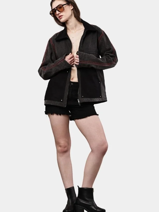 Bold red thread detailing highlights the construction lines and patch placement, creating a striking contrast against the black denim. The jacket maintains a classic silhouette with a structured collar and a clean front closure, making it versatile for everyday styling.