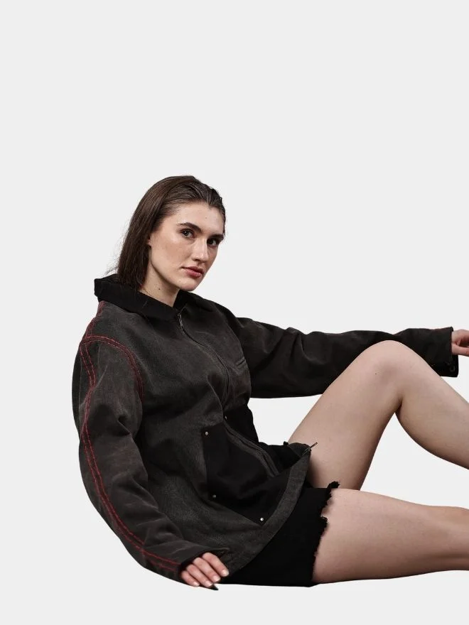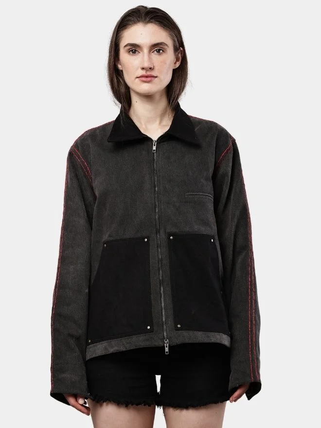 A unique reworked denim jacket crafted from black denim featuring authentic Carhartt double knee patches on the front. Finished with bold red thread detailing and a structured collar design, this piece blends workwear heritage with modern streetwear aesthetics.