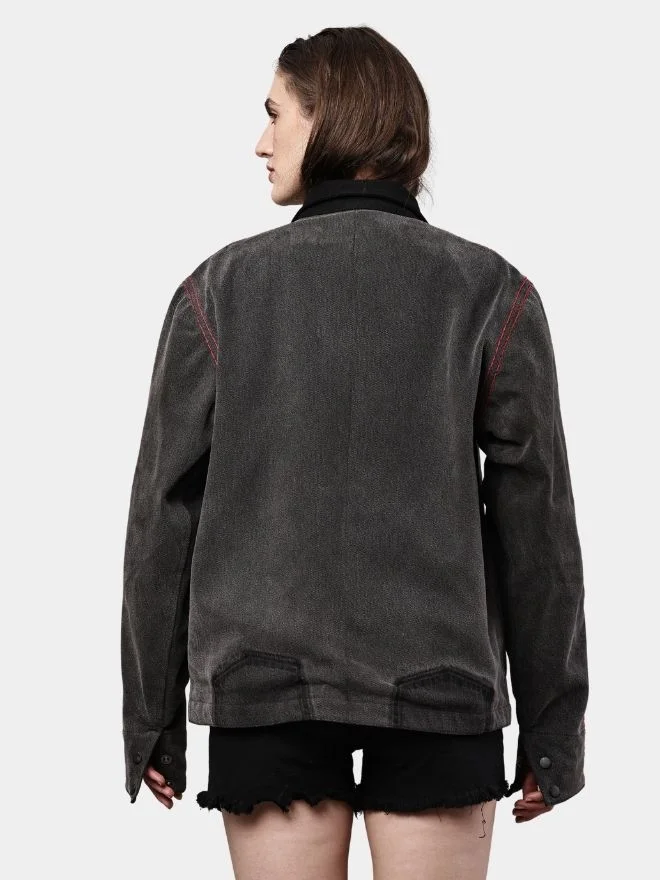 Inspired by vintage workwear and contemporary street fashion, this piece blends rugged functionality with modern design. The unique patch placement and contrast stitching give the jacket a handcrafted, upcycled character that stands out from standard denim outerwear.