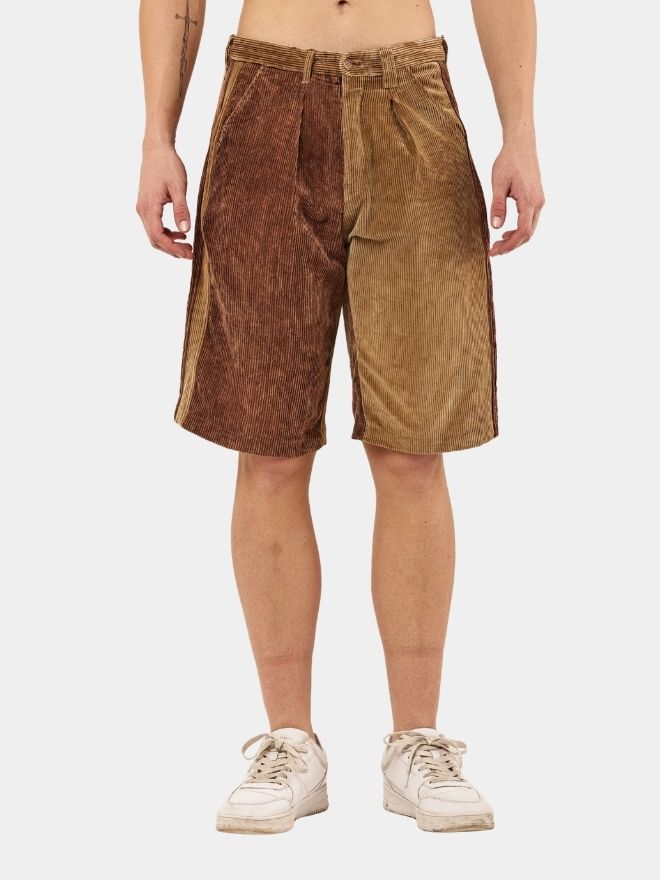 These distinctive jorts are carefully reconstructed from authentic vintage corduroy pants, transformed into a bold yet wearable statement piece. Designed in complementary beige tonal shades, the contrast panel construction creates a subtle yet eye-catching two-tone effect.
