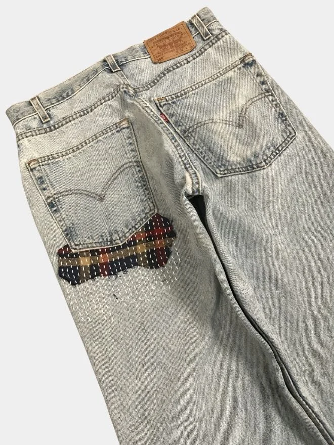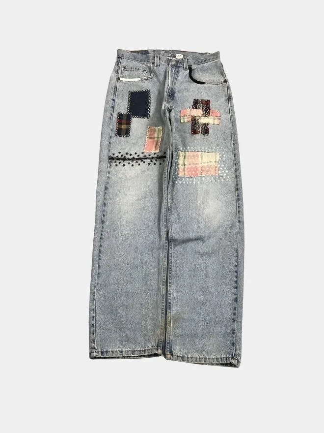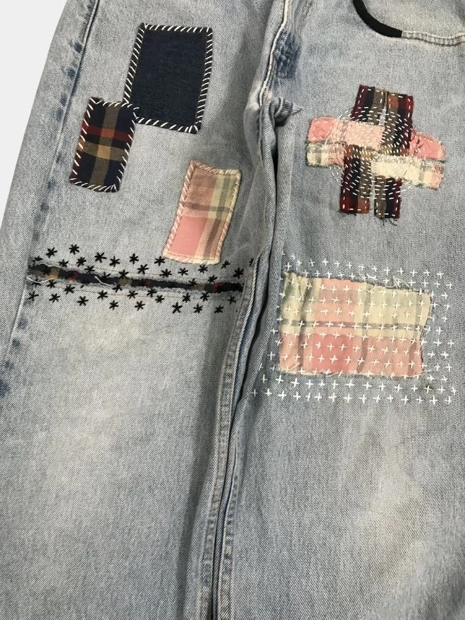 Reworked denim pants featuring white thread sashiko-inspired stitching, patchwork detailing, and satin embroidered pockets. A handcrafted design that highlights traditional stitching with a modern streetwear silhouette.